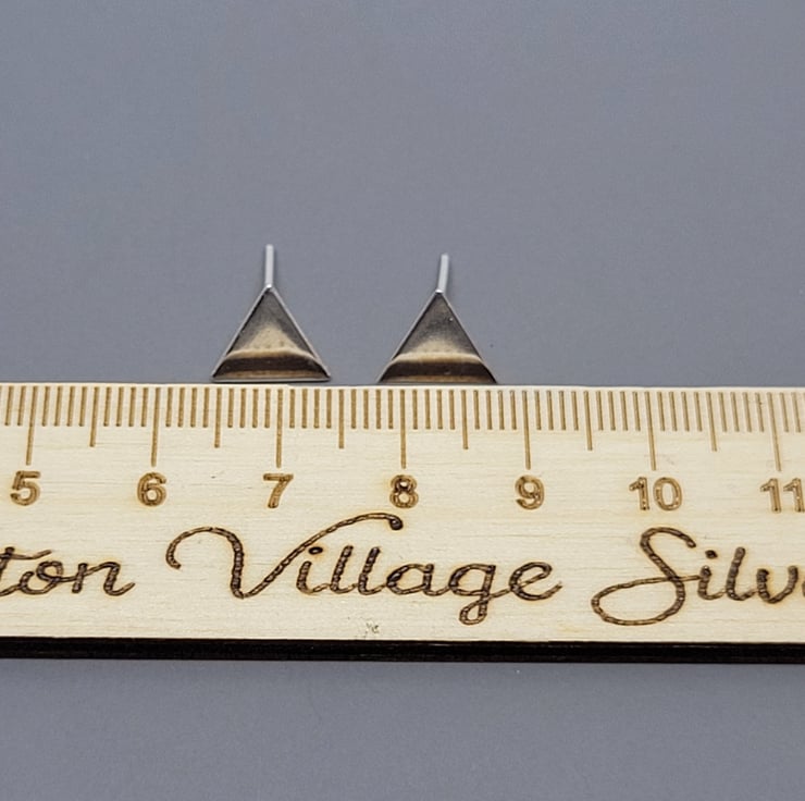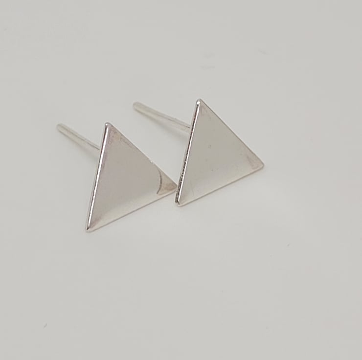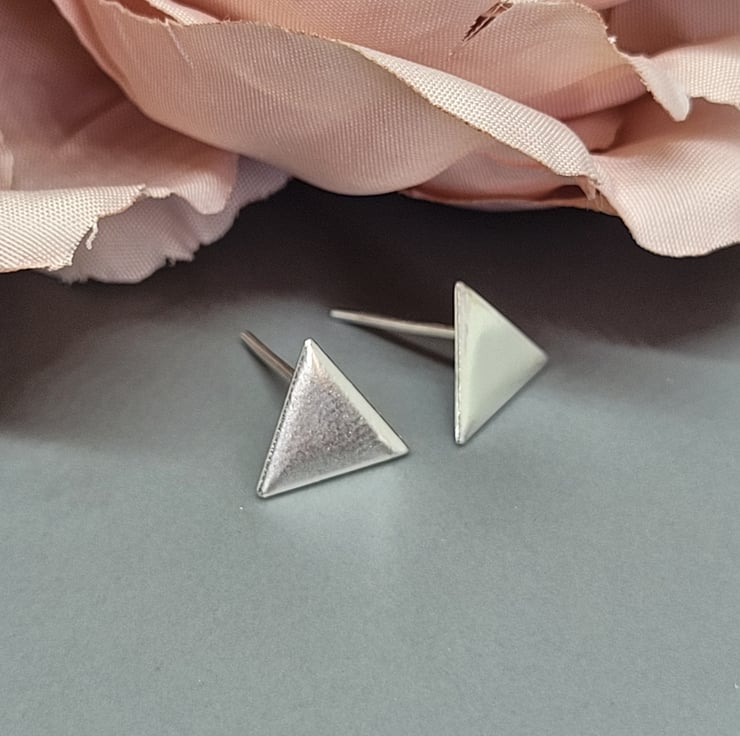 This is mini pair of triangle stud earrings handmade from recycled sterling silver. The triangle measures approx 1 cm across, has an earring post attached, and then completed with a sterling silver push on butterfly back. The earrings are then cleaned and polished to a high shine.