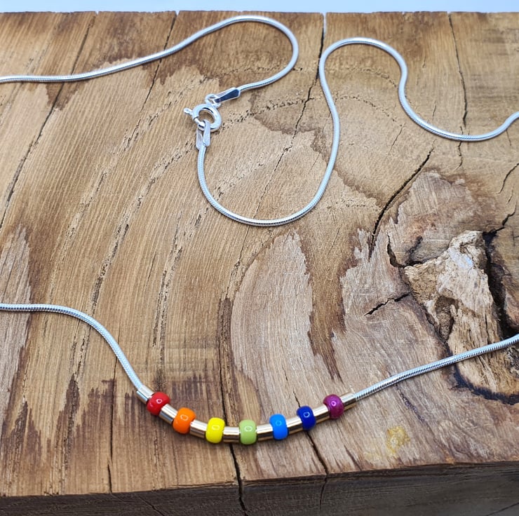 Rainbow choker with little 14K gold filled tube beads on a sterling silver snake chain.