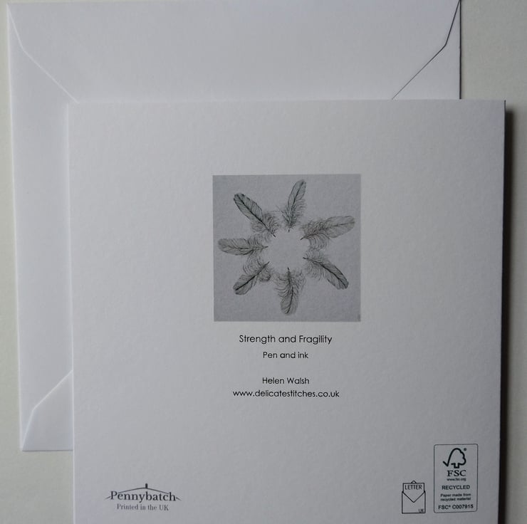 I spend a lot of time collecting and drawing feathers. This card is a photographic print of one of my original pen drawings 'Strength and Fragility' featuring fluffy grey feathers with precious gold tips.