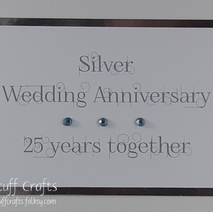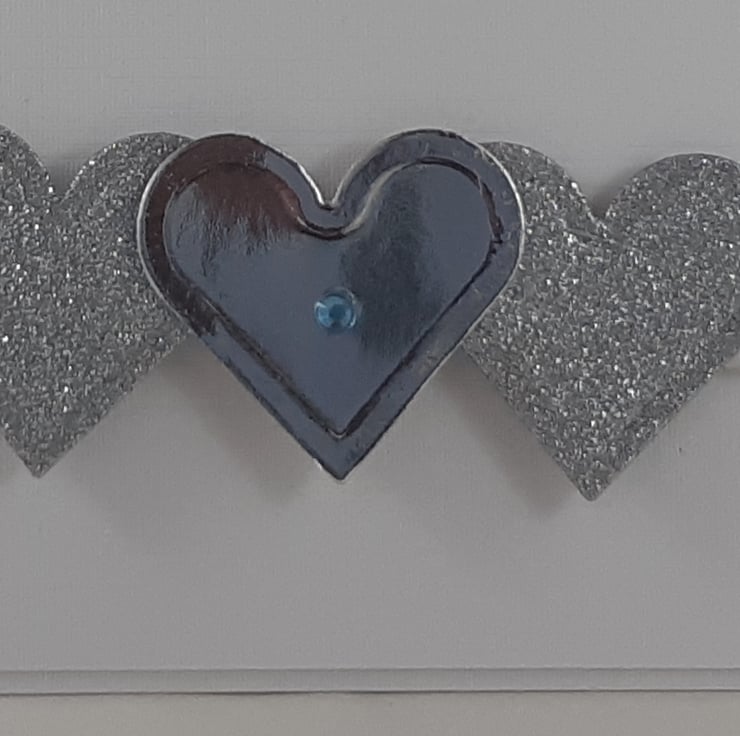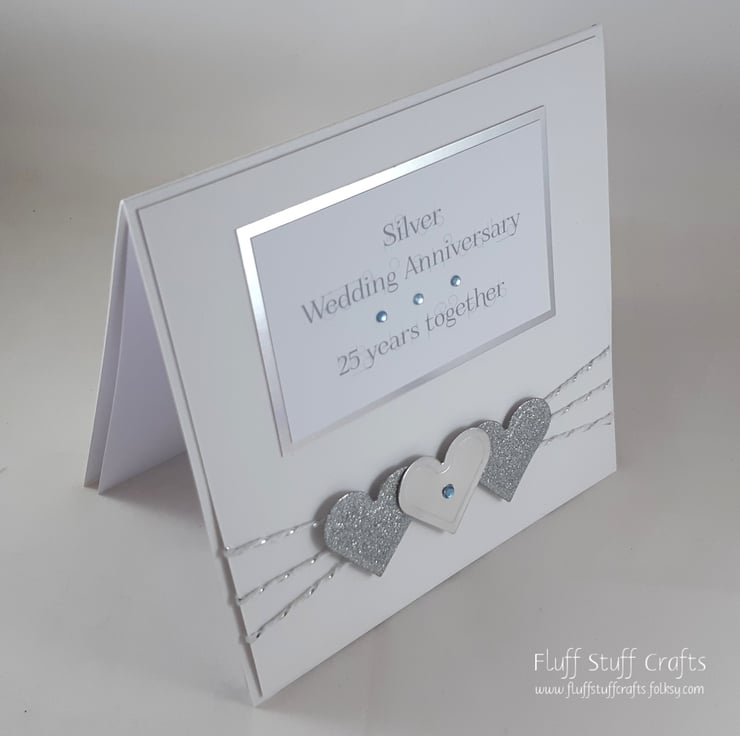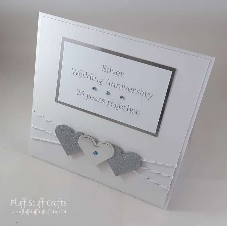 Square 25th Anniversary card featuring a silver foiled panel with the sentiment 'Silver Wedding Anniversary 25 years together' mounted onto silver mirri card. Below this there are three overlapping, die cut, hearts (two glittered and one mirri card) laid over a length of silver and white baker's twine. One of the hearts has a small blue gem in the centre.