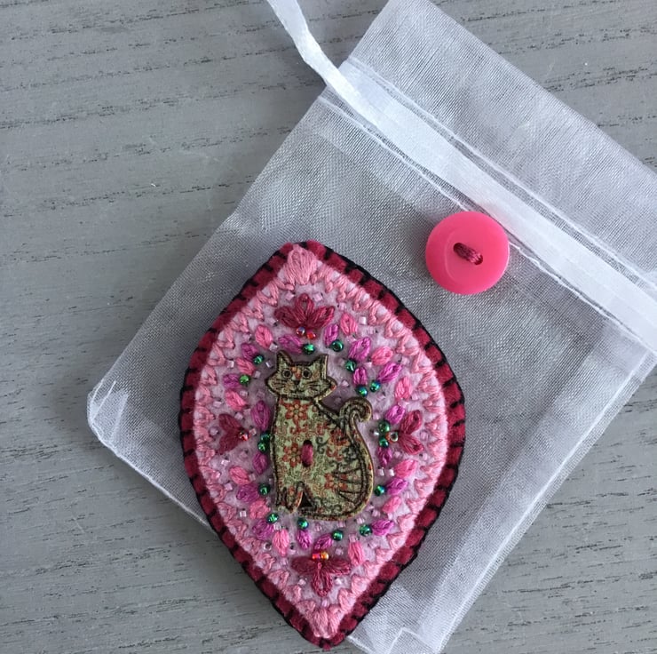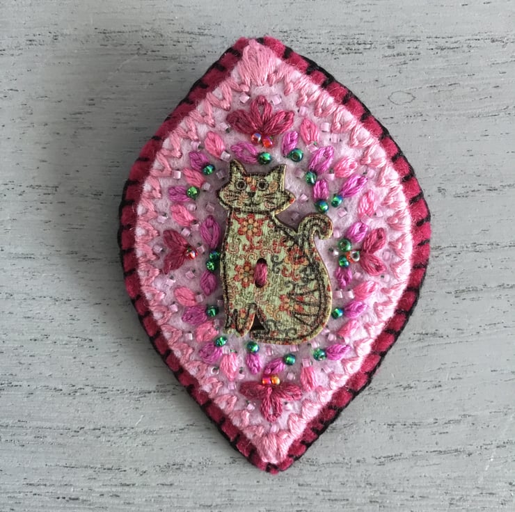 I loved hand embroidering this brooch in pretty pink colours around this Cat button.....it’s ready to be worn......