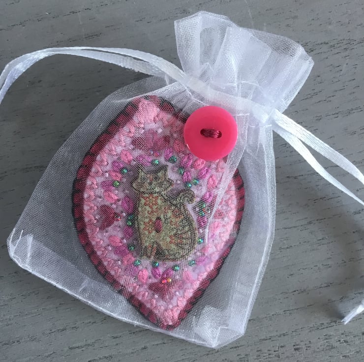 This Hand Embroidered Cat Brooch is gift wrapped in an organza bag, decorated with a pink button.....a protective bag to keep the brooch in when not worn. A perfect birthday, Christmas, thank you or friendship gift. A perfect gift for cat lovers……It’s light to post so makes an ideal letterbox gift ....
