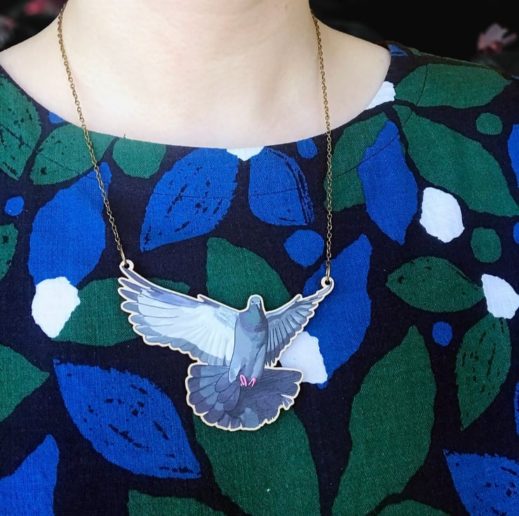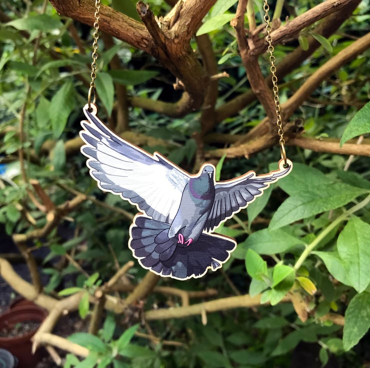 This laser cut wooden statement necklace shows a majestic pigeon flying with wings outstretched. Taken from my original illustration this image pics up every beautiful detail and colours of the pigeons plumage. A perfect necklace for nature lovers and fans of the mighty pigeon!