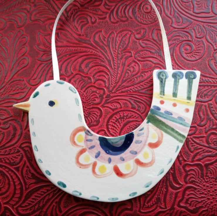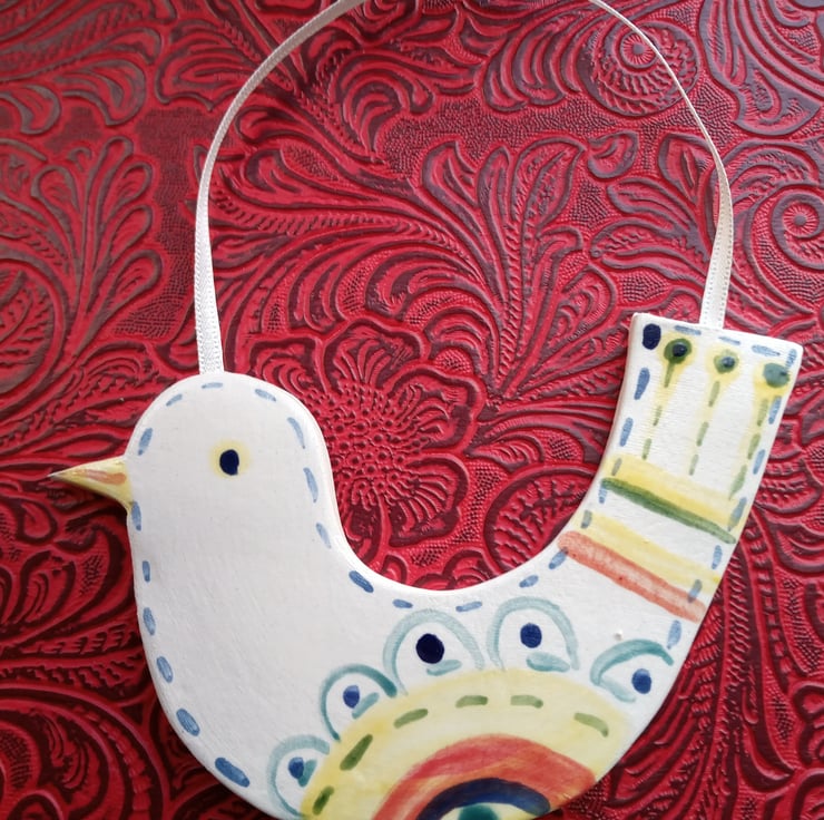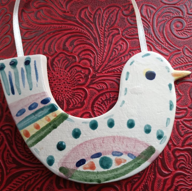 The bird hangs on an ivory ribbon. The bird is approximately 10.5 x 7 cm ( not including the ribbon).
