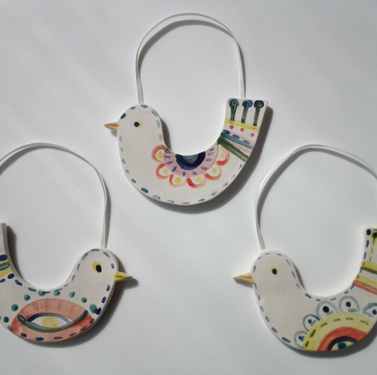 This is a collection of cute whimsical birds, decoration with bright bold colours. I use a white earthen ware, so the coloured glazes are vibrant.