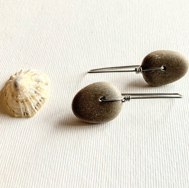 The neutral taupe pebbles are approximately 2cm by 1.5cm. They are attached to handmade, stainless steel earwires, with long backs.