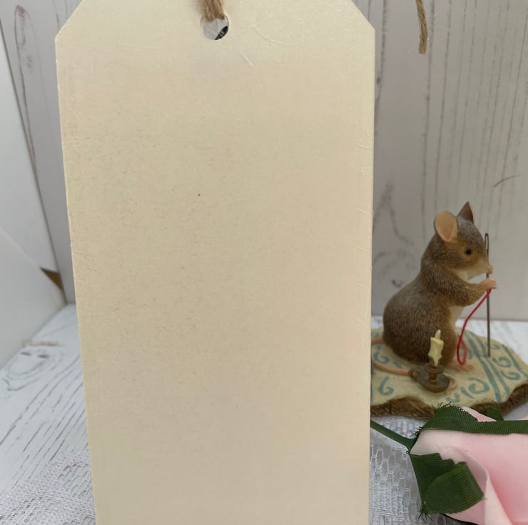 Pearl cream card with a pink rose and hole reinforcer, with string for tying.