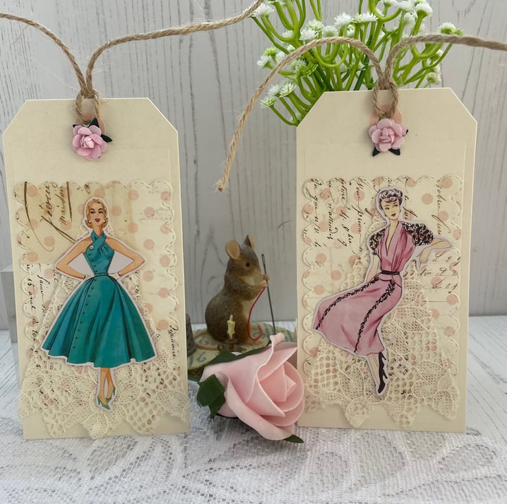 Pretty vintage style polka dot backing paper with script. Cream lace and a fussy hand cut fashion image.
