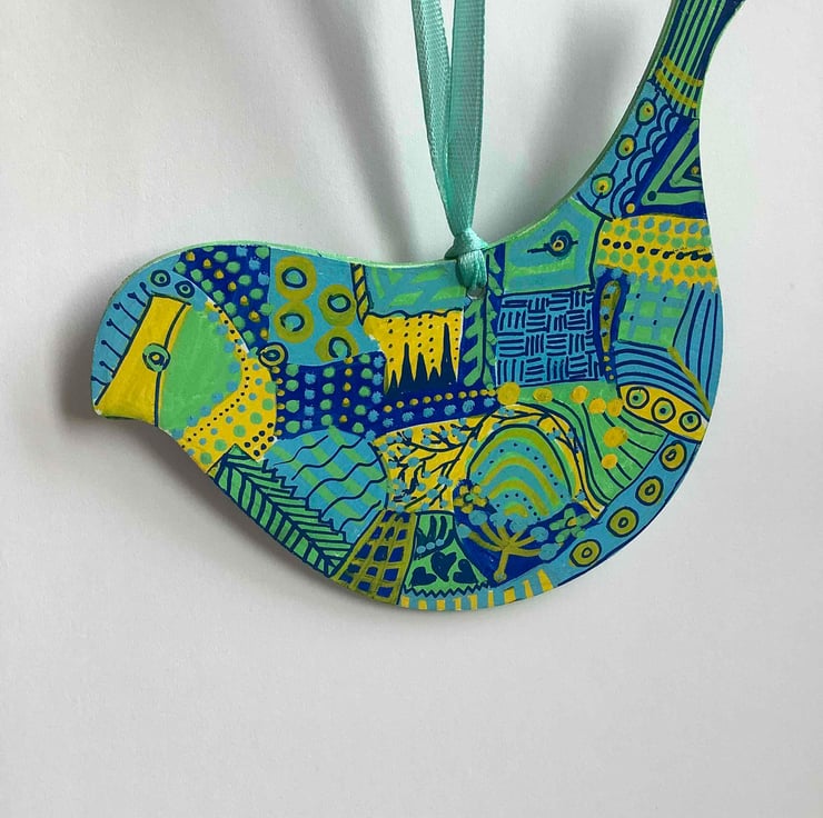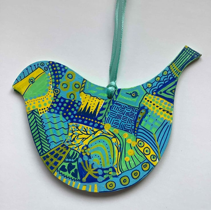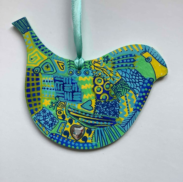 This wooden bird has been hand-painted in turquoise, yellow, green and blue. It hangs from a pale turquoise silky ribbon and there is a silver heart embellishment on the lower body of the bird at the front.