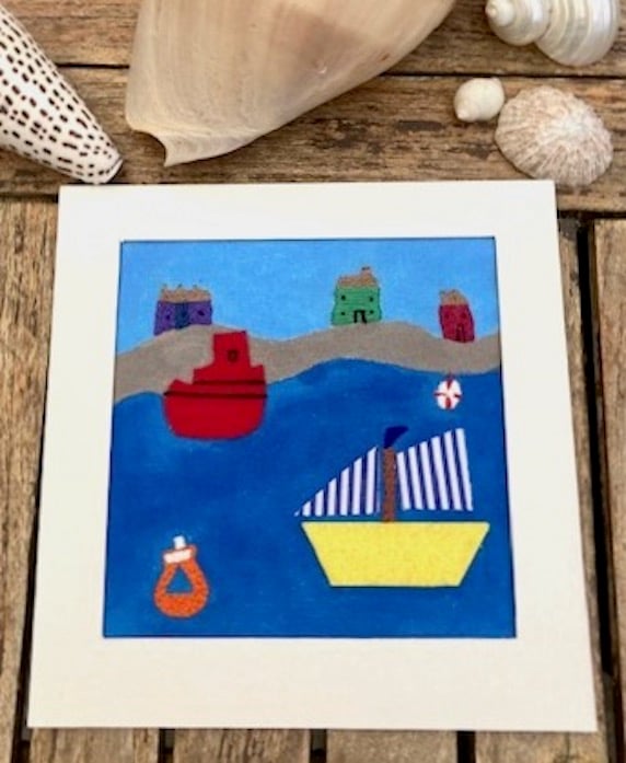 This delighted scene has been created by painting a background onto linen in colourful blue acrylic paint and then adding felt ships, sails using re-cycled material & hand embroidered houses, buoy & ring. The picture has been framed with mounting board to create a 17.3 cm x 17.5 cm piece of art. It is backed with linen. You could hang the picture up as it is or add your own glass frame.