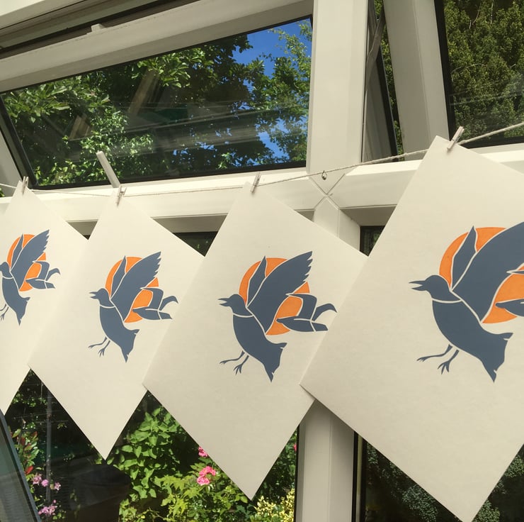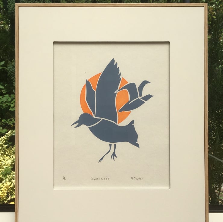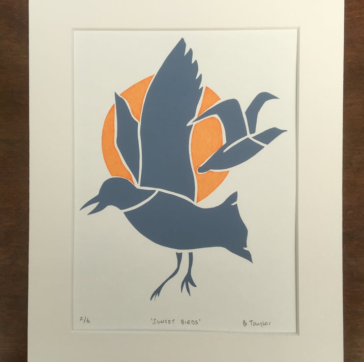A design I created many years ago and only now been brought to life. We usually associate certain colours when thinking of birds in flight with a sunset backdrop. The blue birds in this image combined with the orange create a much softer and contemporary look to a typical sunset or sunrise scene.
