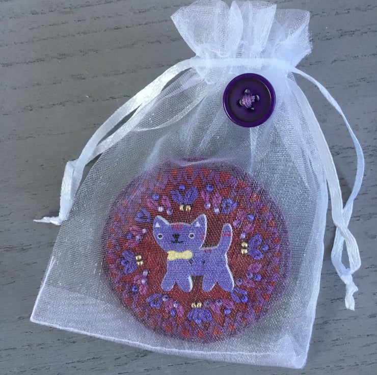 This Hand Embroidered Lavender Cat Brooch is 2.50 inches (6 cms) diameter ....so a nice wearable size. A metal brooch pin with a safety catch is stitched onto the back. It’s ready to wear on a cardigan, jacket, coat or dress.