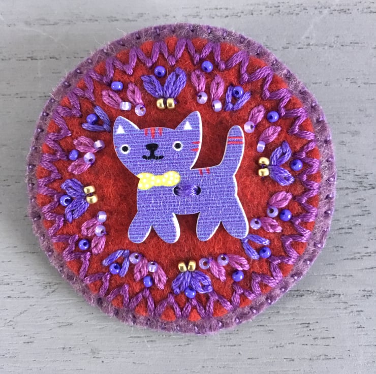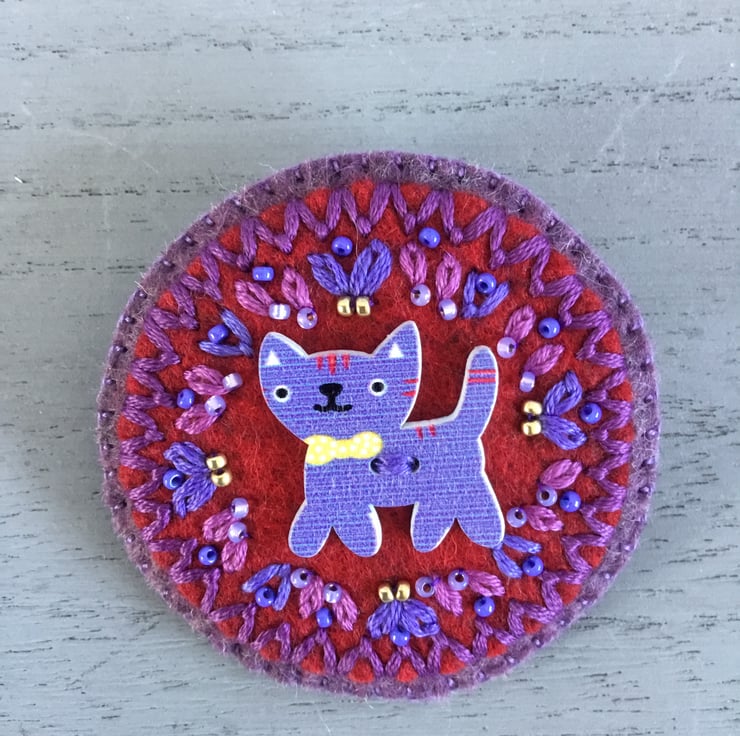This Hand Embroidered Lavender Cat Brooch has a wooden lavender coloured Cat button, stitched onto circles of berry red and heather felt. She is surrounded by hand embroidered Lazy-Daisy and Fly Stitches in dark pink and lavender embroidery threads, with golden, pink and lavender seed beads.