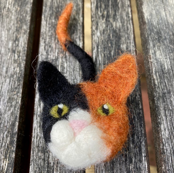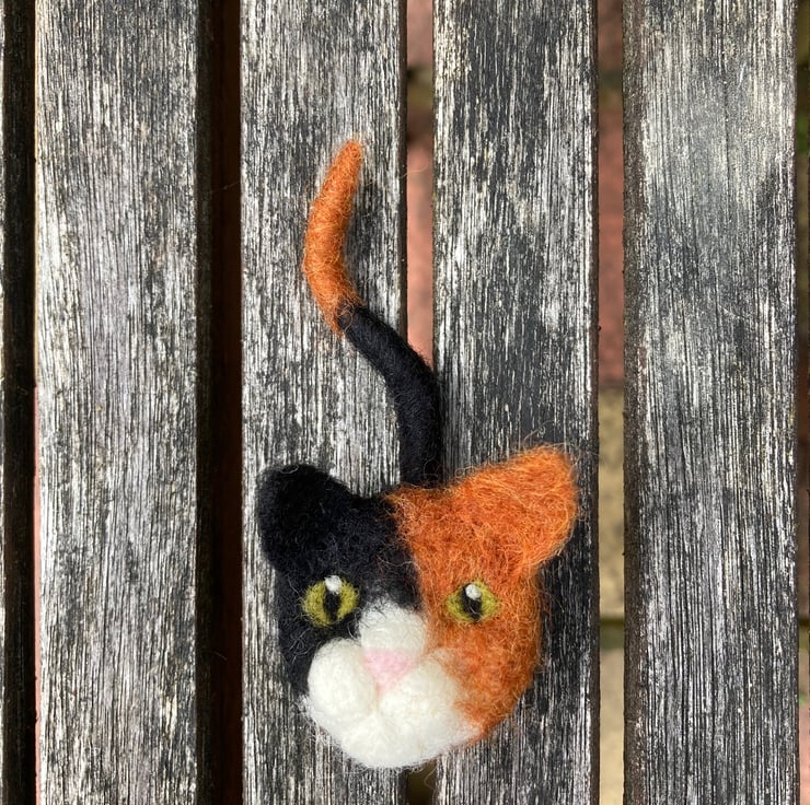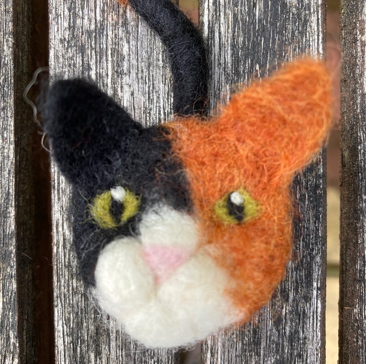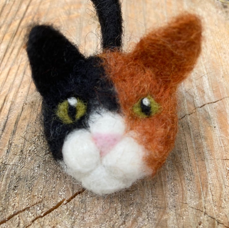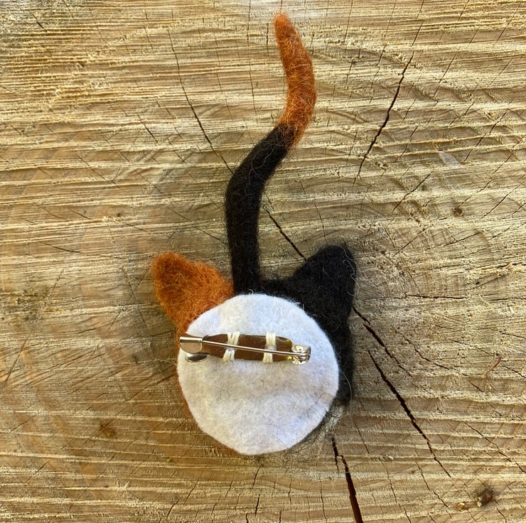 A must for all cat lovers! This gorgeous cat brooch has been needle felted from woollen fibres. A disc of core wool fibres has has facial features added and then covered using a top coat of ginger and black to create a tortoiseshell cat. A tail formed from a wire pipe cleaner covered in woollen fibres has been attached to the reverse and a silver tone brooch pin added. The inclusion of wire in the tail make it slightly poseable. The main body of the cat is approximately 4 cm in diameter and the tail approximately 6.5cm long.