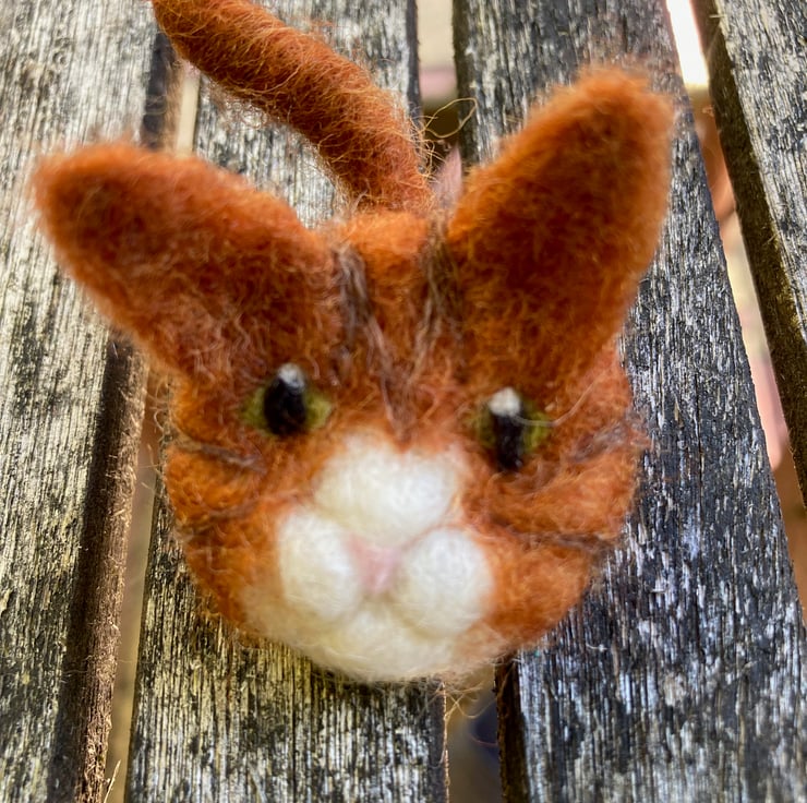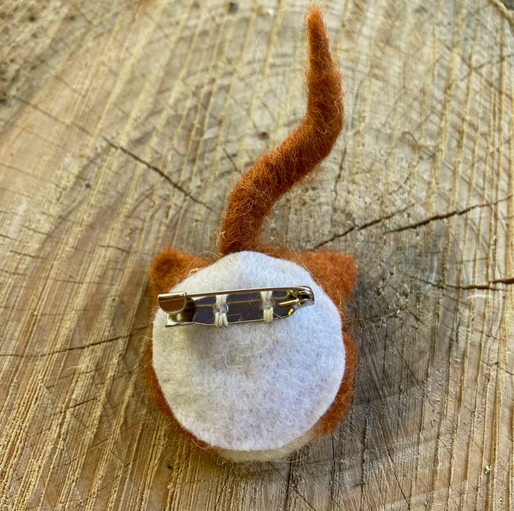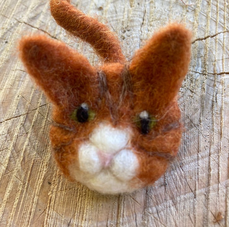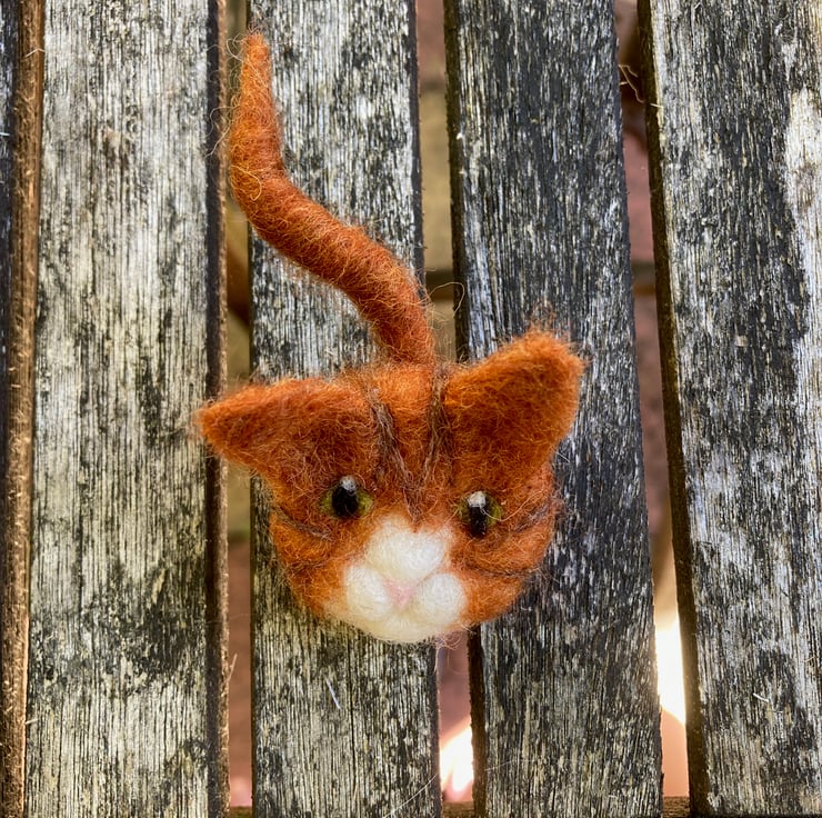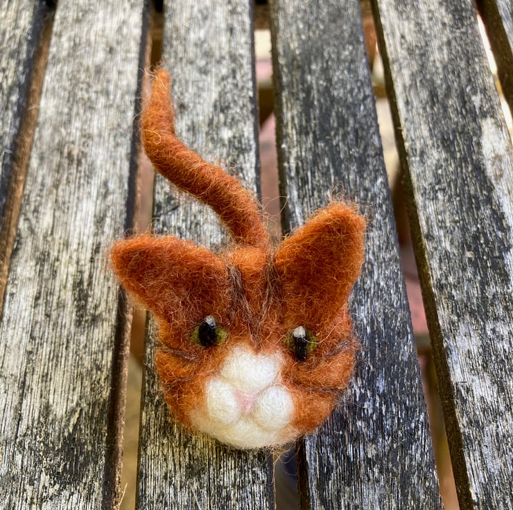 A perfect gift for cat lovers, this needle felted ginger cat brooch has been made using woollen fibres. Core wool has been felted and shaped using a barbed felting needle to create the main disc shaped body. The facial features have then been added along with a ginger coloured top coat, The eyes and ears are felted and the tail is formed using a pipe cleaner covered in wool fibres allowing it to be slightly possible. Finally the tabby markings have been added and a silver tone brooch pin secured to the reverse. The body of the cat measures approximately 4cm in diameter with the tail approximately 5.5cm long.