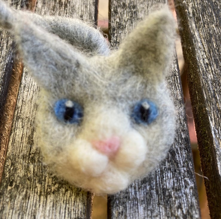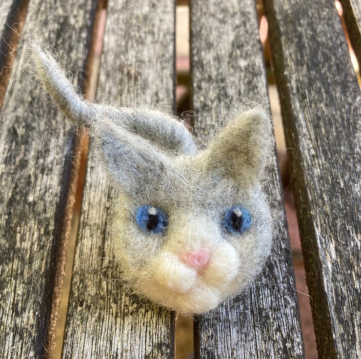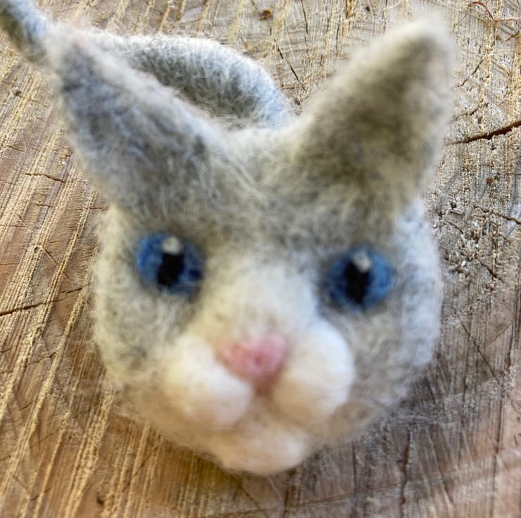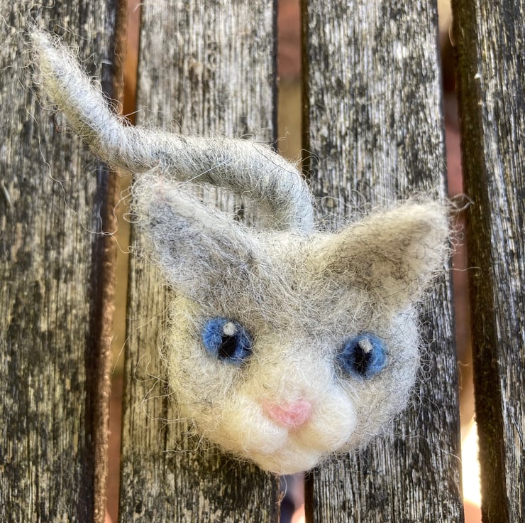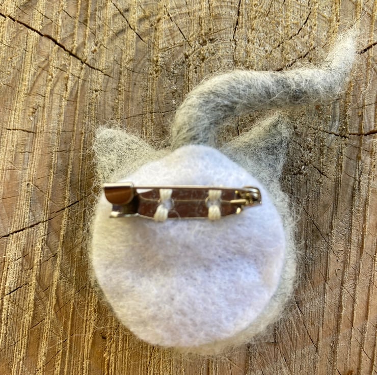 This cute little grey cat with striking blue eyes has been needle felted and made into a fun brooch which would make a perfect gift for cat lovers. The grey cat has been needle felted using woollen fibres and a barbed felting needle. A central disc of core wool has had the facial features added and a covering of grey wool applied. The tail has a central wire pipe cleaner running through the wool covering allowing it to be gently posed. Finally, a silver tone brooch pin has been secured to the reverse. The body of the cat measures approximately 4cm in diameter with the tail approximately 5.5cm long.