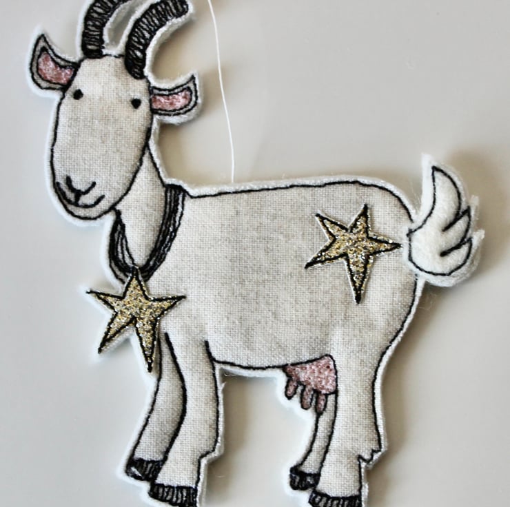 Goats are sewn using 100% wool felt, cotton cloth, glitter cloth and free hand machine embroidery; multiple layers of cloth are sewn together and cut out by hand using sharp scissors. There is a linen string to hang measuring approximately 50cm.
