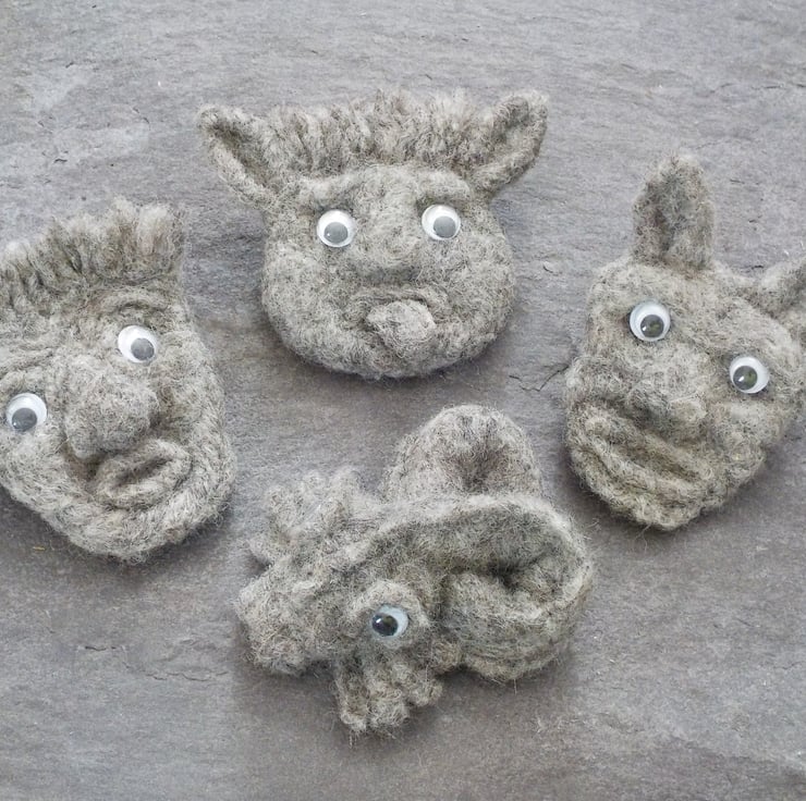 I make little fridge magnets for a bit of fun in between larger projects. These are pure British Shetland wool, felted into shape and then decorated. I then attach a magnet onto the back so it will stick to your fridge or magnetic noticeboard. This range is a bit different, with much more 3d relief detailing. A lovely little gift for the person who has everything!