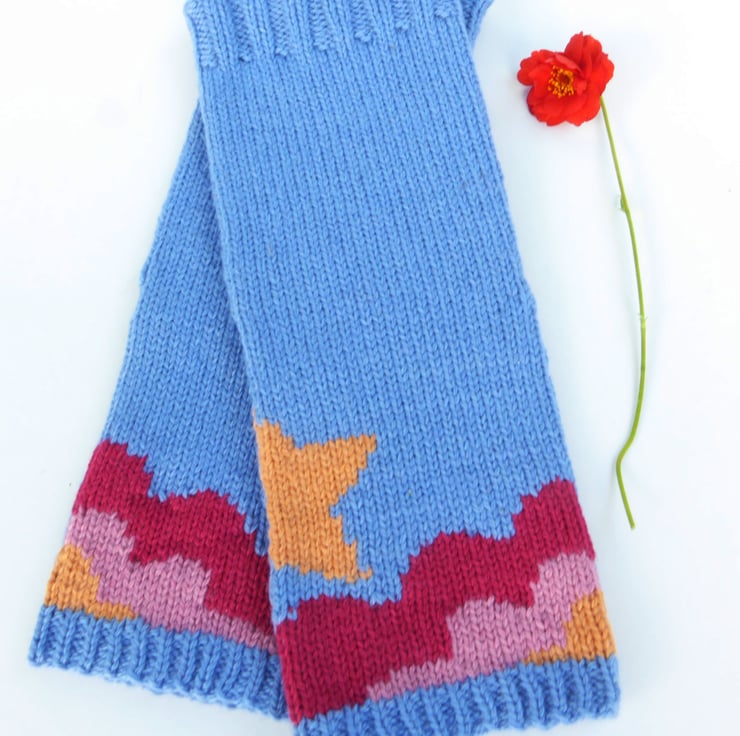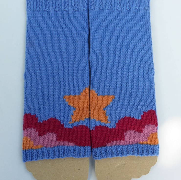 Rainbow clouds and star Yoga socks that have open toes and heels made from 4ply organic merino wool and cotton yarn. I made these socks on my vintage knitting machine using the Intarsia Knit method, so there are no yarn floats on the inside of the socks. The socks will keep your feet comfy and warm in exercise classes.