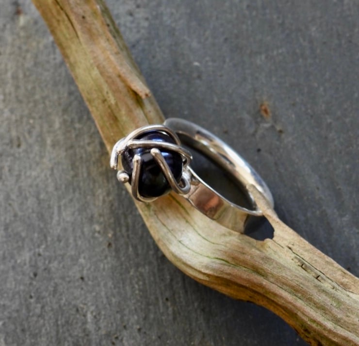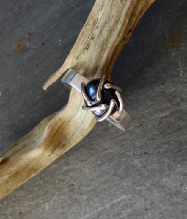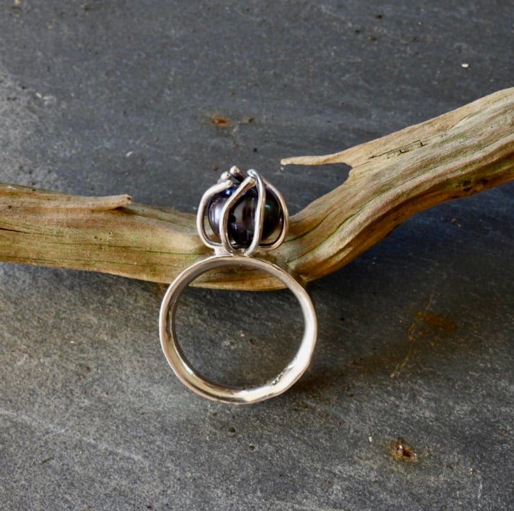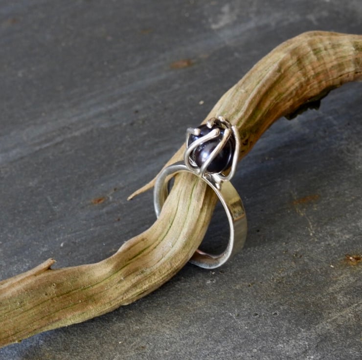 Looking like a flower bud just starting to open this silver ring has a contrasting natural black pearl in the centre. A real statement for evenings out, cocktails and dinner, we can all dream. Set on a slightly wider half round polished and lightly textured band to add to the elegance. Handmade and unique.This one is a UK size N1/2. What size would you like, let me know and I will make it for you.