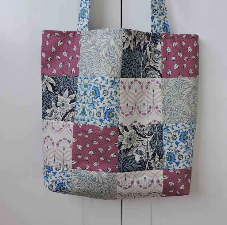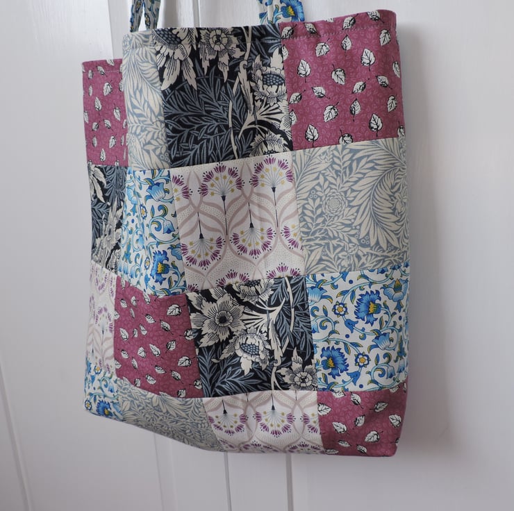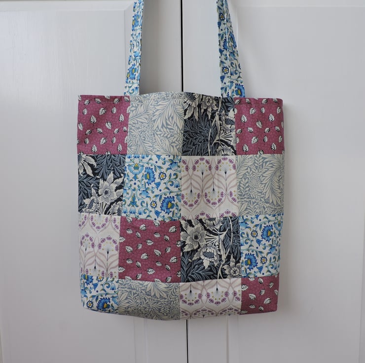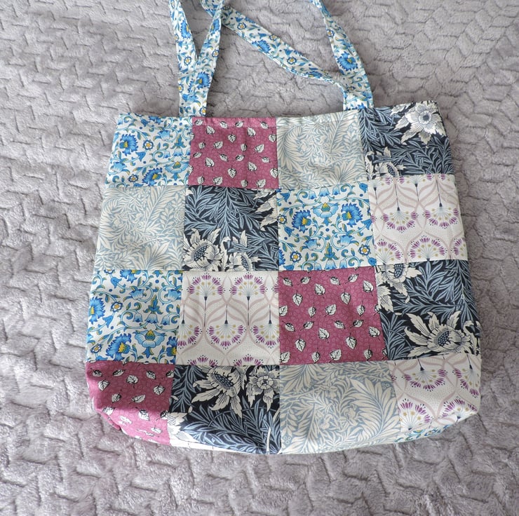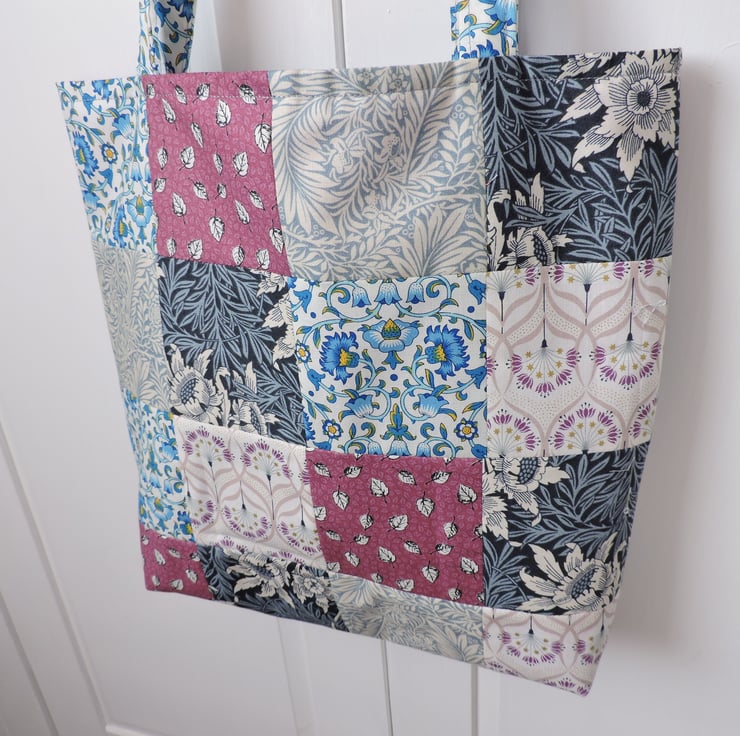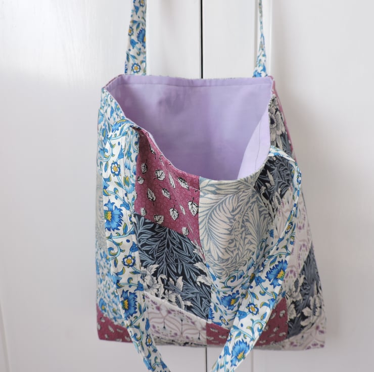 This colourful patchwork tote bag has been made with squares of assorted cotton fabrics. The fabrics which depict assorted flowers and leaves are in the lovely colours of raspberry pink, dark blue, light blue, gentian blue, yellow and white. It is fully lined with a plain lilac cotton. It has a squared off bottom and has interfacing to give stability. This bag folds easily to fit in a pocket, bag or suitcase making it the perfect resuable tote bag.