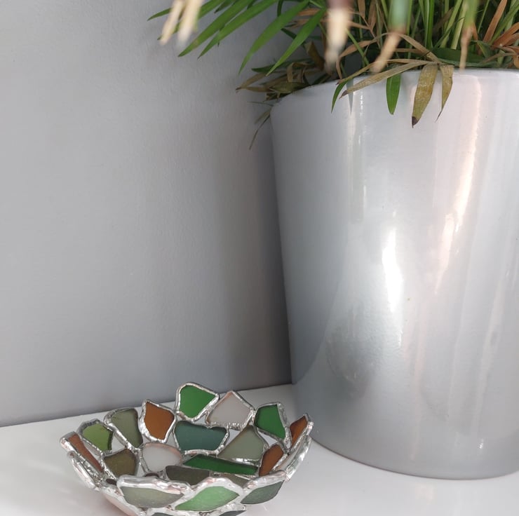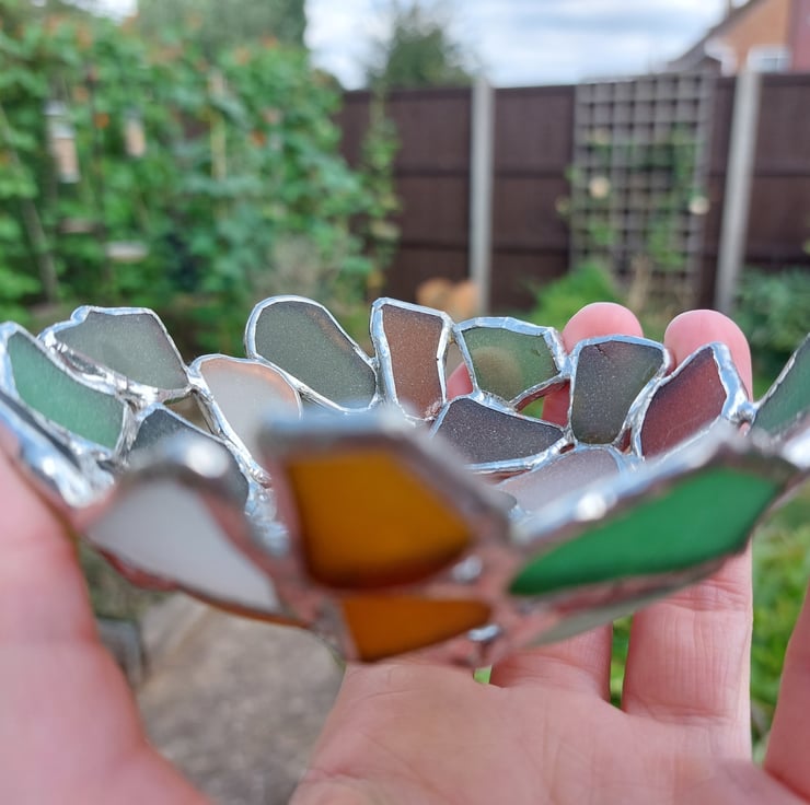 A really stunning trinket dish made from natural sea glass which has been soldered together to form a delicate little dish, perfect for your keepsakes. Each piece of glass is individually wrapped in copper foil before being soldered into place by heating up the metal until it is molten and allowing it to flow along the copper. This is a beautiful and personal gift, something a little bit different for a special occasion.