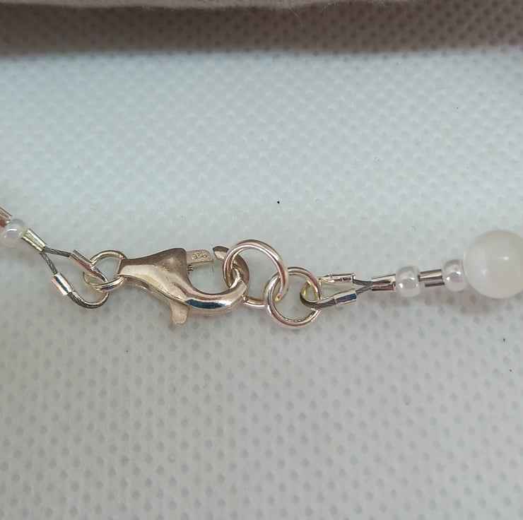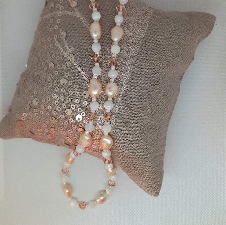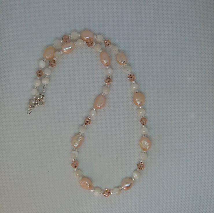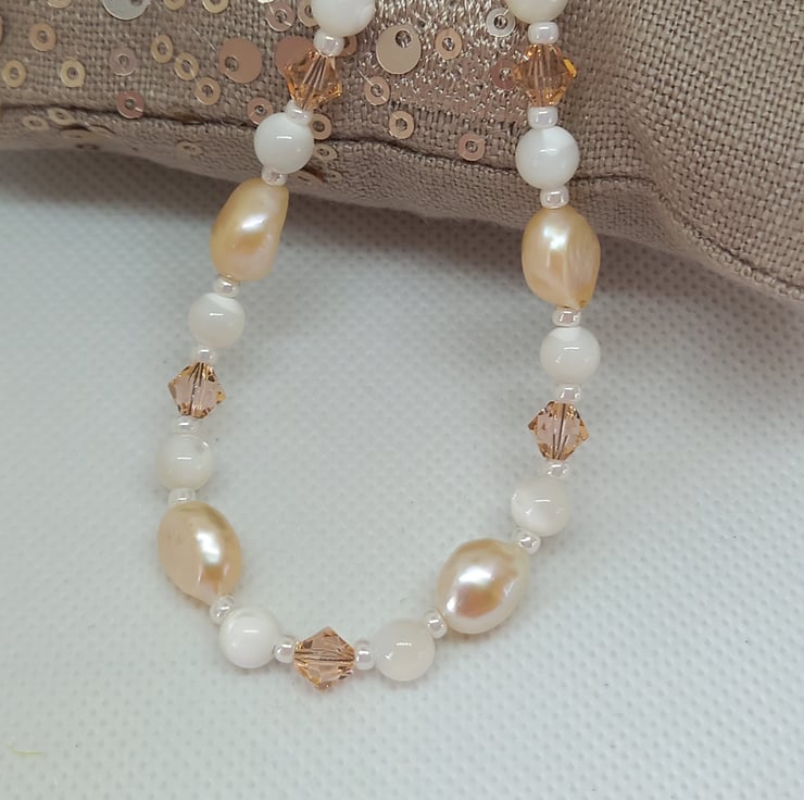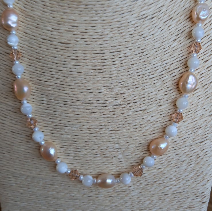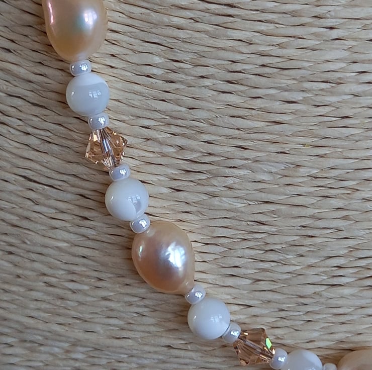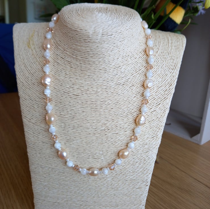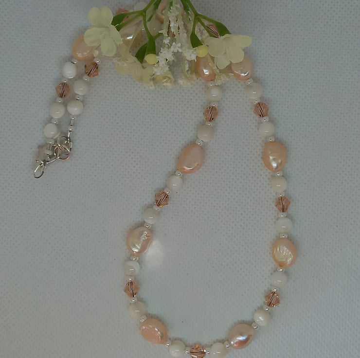 A really elegant necklace for a special day, or any day. Peach freshwater baroque pearls combine with peach Swarovski crystals and mother of pearl beads with Miyuki seed bead spacers. All the beads are threaded onto 49 strand beading wire, making this necklace lovely and flexible. The baroque pearls are approx. 10 x 12mm and the crystals and mother of pearl beads are 6mm. The necklace is securely finished with wire guardians and fastens with a sterling silver clasp and ring.