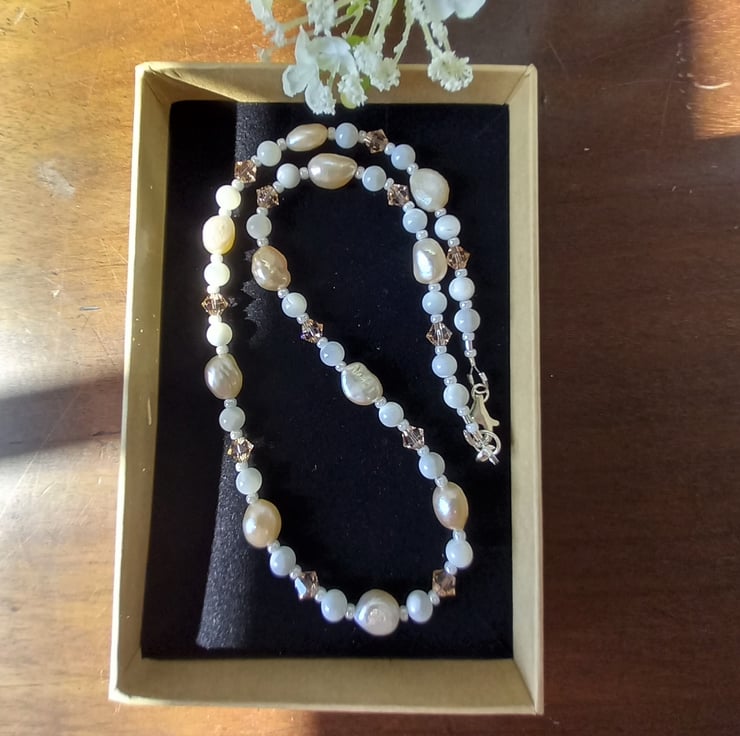 The baroque freshwater pearls were the starting point for this elegant necklace, with the Swarovski crystals adding extra sparkle. Ideal for a wedding, or for any time you want to feel special!