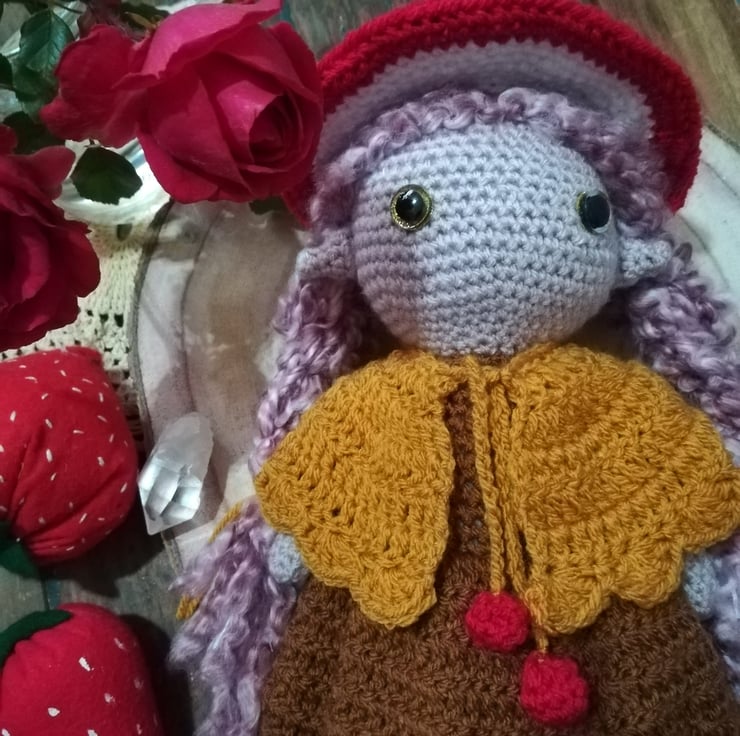 Her toadstool hat is held with safety pins so can be removed if you prefer. She has the most amazing pink hair in braids.