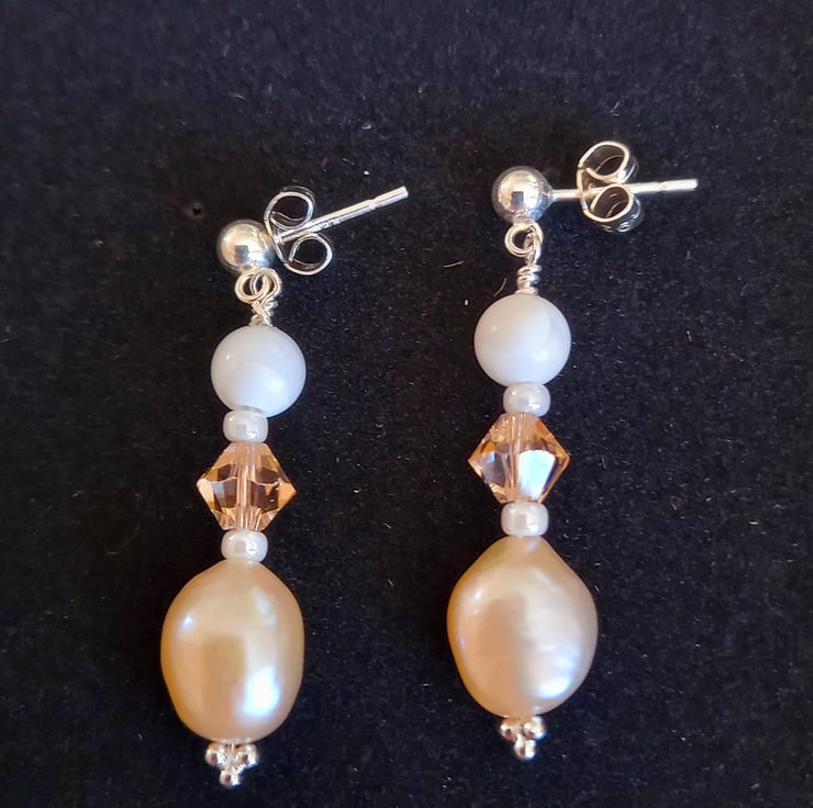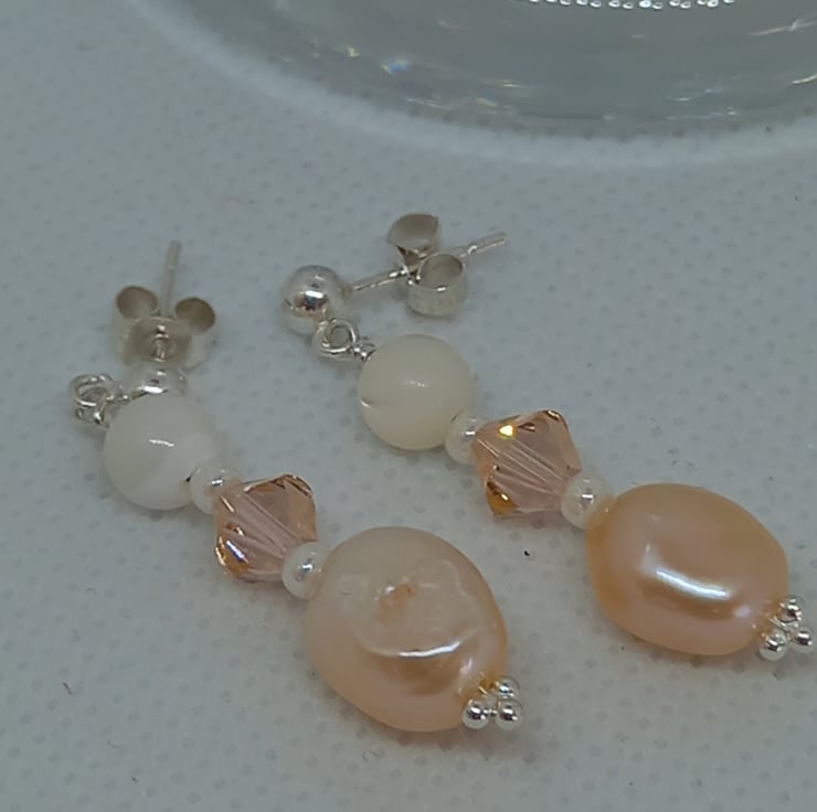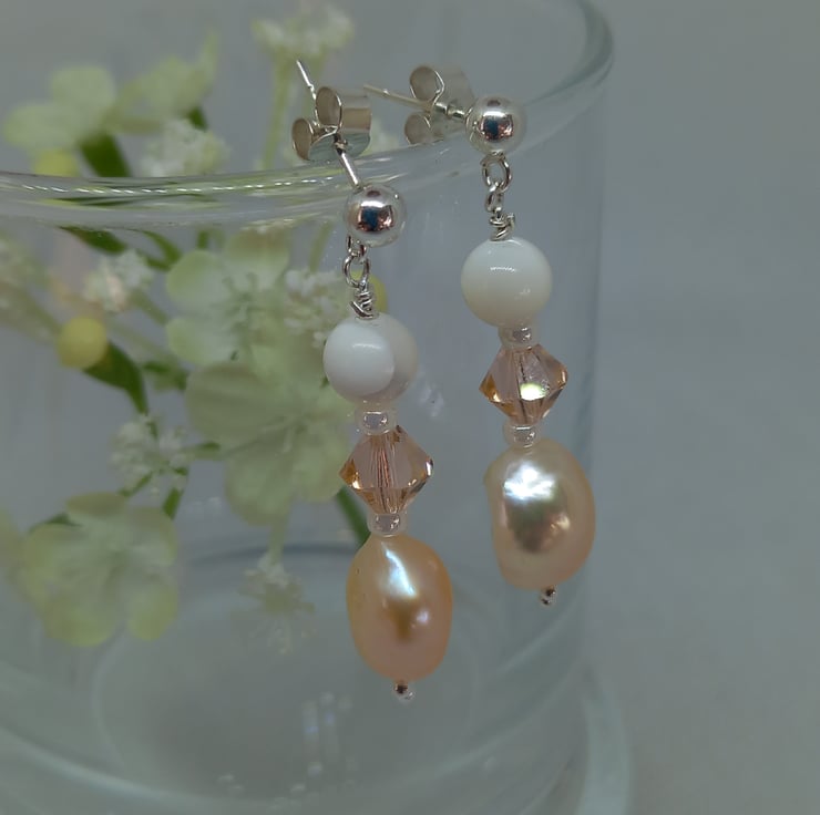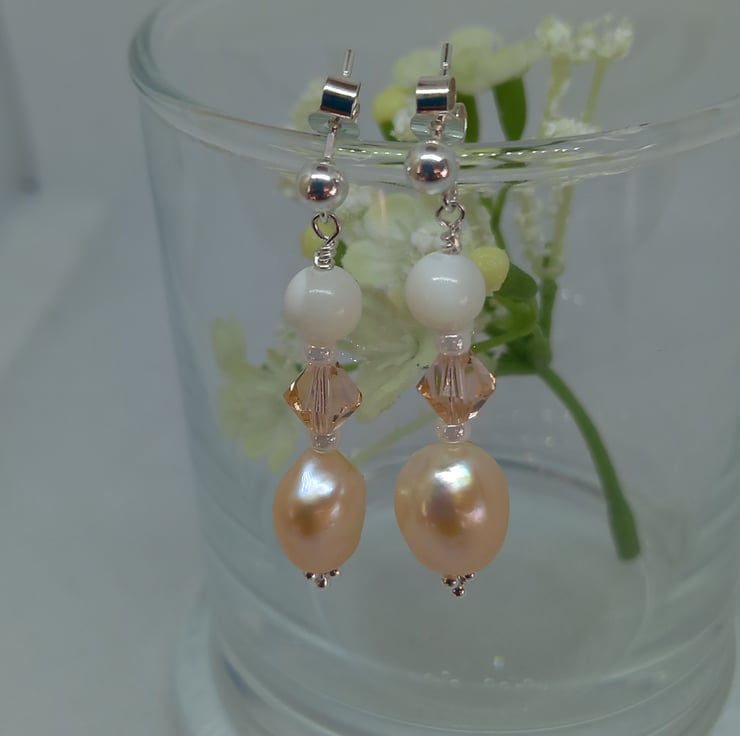 These are the matching earrings for the Freshwater Pearl and Swarovski Necklace. A gorgeous mix of peach freshwater baroque pearls, Swarovski crystals and mother of pearl beads with Miyuki seed bead spacers. The beads are threaded onto sterling silver headpins with an unusual decorative base, wire wrapped securely at the top and then fitted onto sterling silver stud posts with a simple ball decoration. The scrolls at the back of the studs are made from 100% recycled sterling silver.