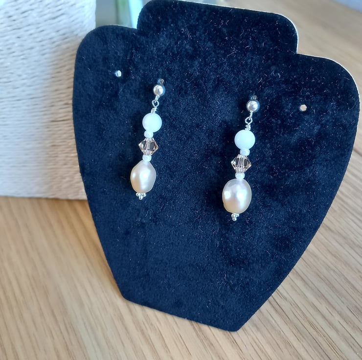 These earrings are the perfect match for the Freshwater Pearl and Swarovski Necklace. These beautiful baroque pearls go perfectly with the sparkly Swarovski crystals and the mother of pearl beads just help to balance the design.