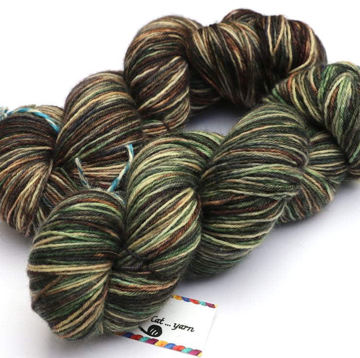 Mottled shades of brown, green and cream (undyed) with some blue-grey hints. This Bluefaced Leicester superwash yarn is soft with a very slight lustre. Photographs have been taken and edited in bright natural light. There There is one skein left - it is the browner of the two skeins as shown in the first photo and the rear of the second photo.