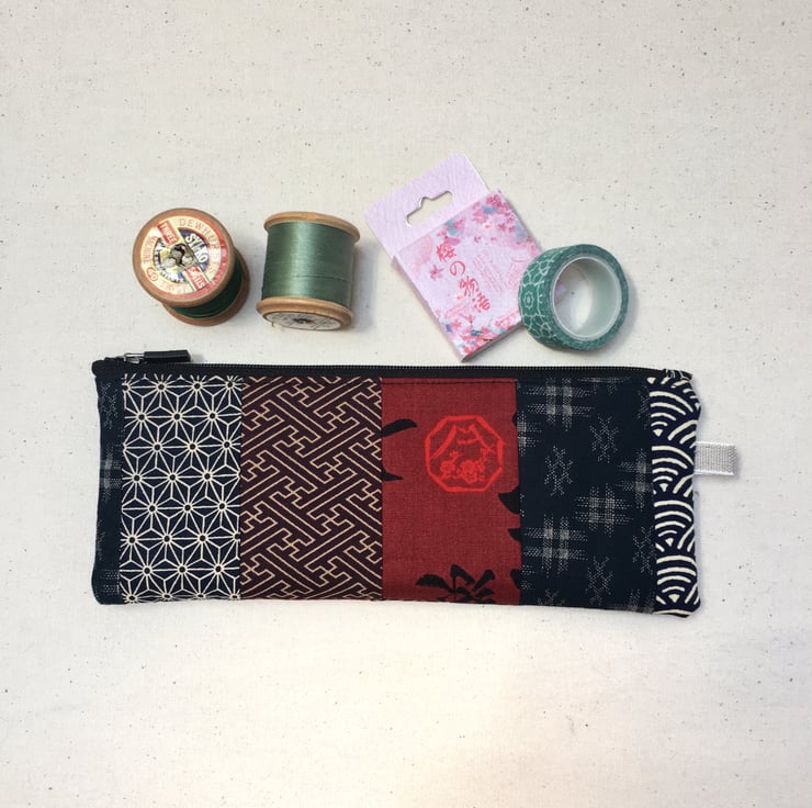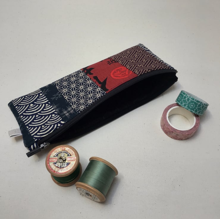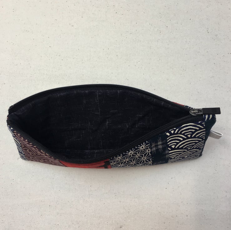 An array of Japanese patterned fabrics from Japan has been used to create these lightly padded slim pencil cases or pouches. The patterns include indigo seigaiha (waves), purple sayagata, indigo asanoha (hemp leaves) and a red fabric with kanji and Mount Fuji. Inside is a black and grey cotton fabric.