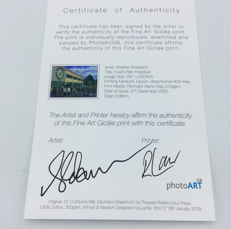 The framed print comes with a 'Certificate of Authenticity' which documents the details of the original painting and the art print. The Certificate of Authenticity is affirmed with a signature from both myself (the artist) and the printer.