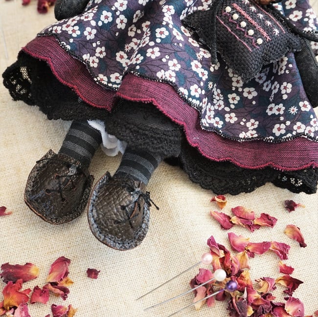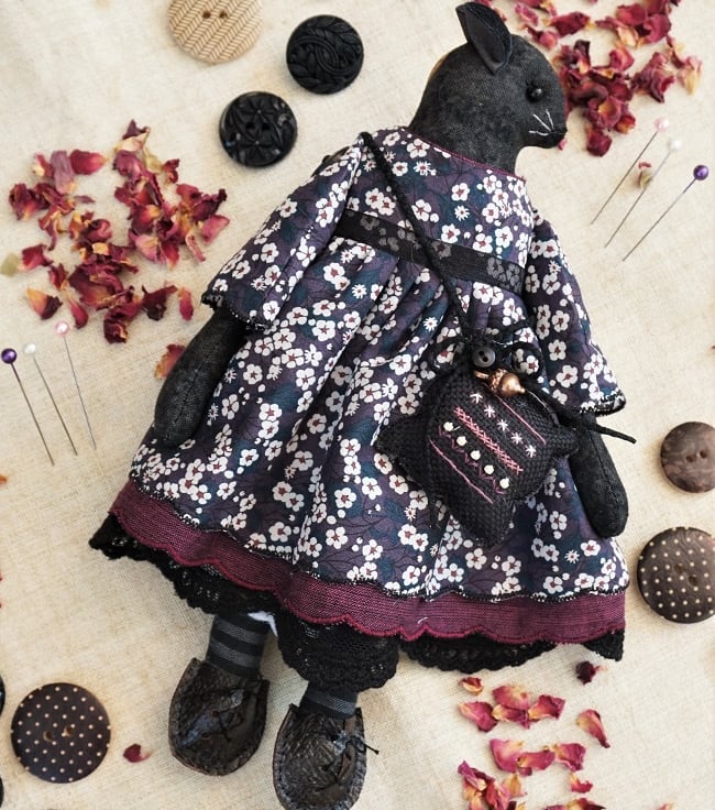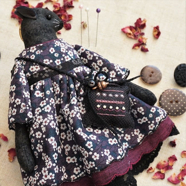 This is Blackcurrent, a tiny midnight mouse. She is a hand embroidered mouse with little leather ears and tail. She is dressed in a Liberty tana lawn cotton called Mitzi Valeria the midnight version in purple with black leaves and white flowers. She has coordinating underskirts in blackcurrant shot cotton, black tulle mesh and white cotton lace bloomers. Her dress is finished with organza ribbon, tiny buttons and little leather shoes. She is a black mouse with black ears and tail, grey wishkers and an embroidered black nose.