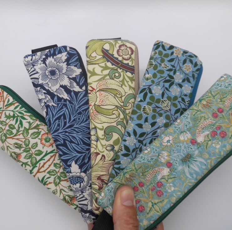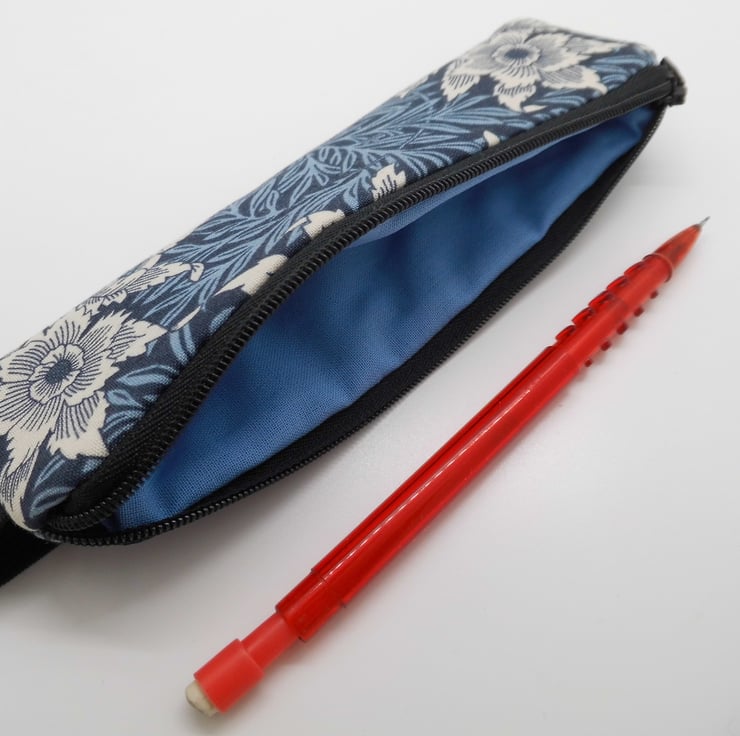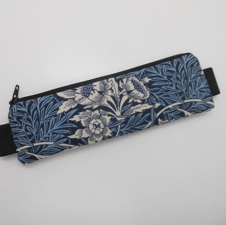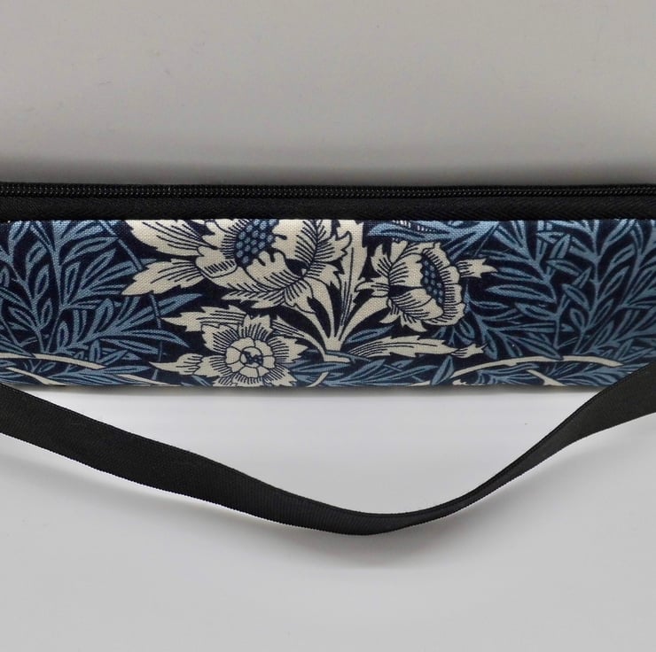This one is made in William Morris design fabric called Tulip and Lily Blue Nights. I backed the fabric with fusible fleece for cushioning, stability and a quality feel. Lined with a quality plain blue cotton.