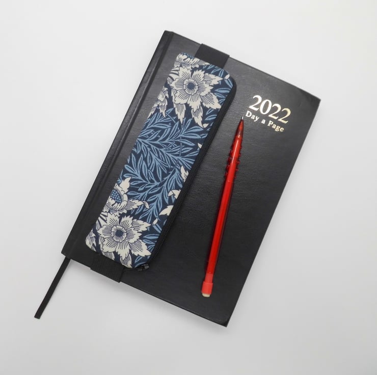 A little pencil case designed to be kept on the front cover of your diary or journal, held in place with an elastic strap. Just slip it on the front cover and you can always have a pen and pencil to hand. Add it to whatever notebook you are using for the day.
