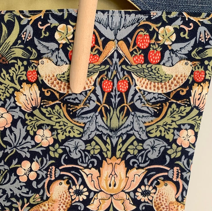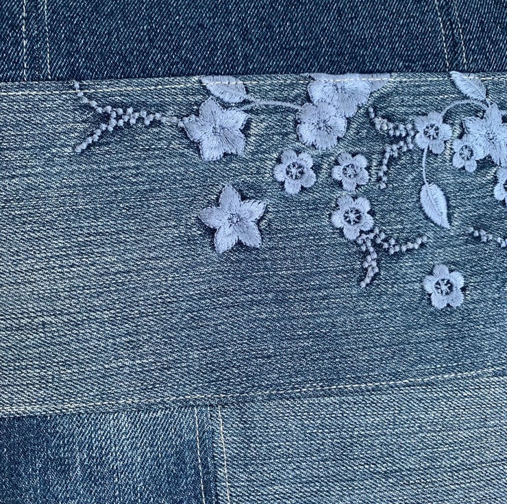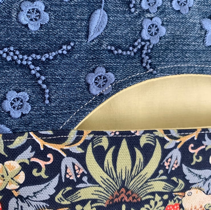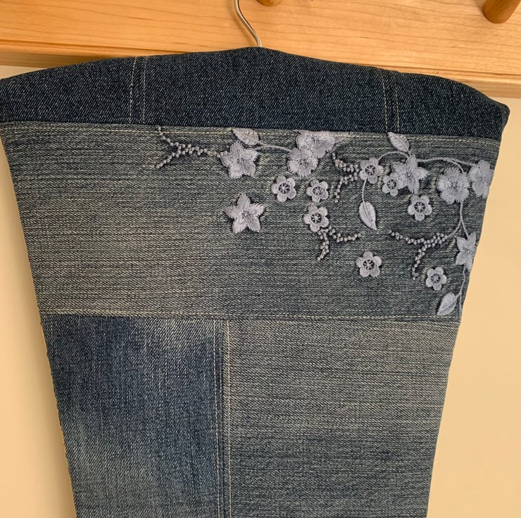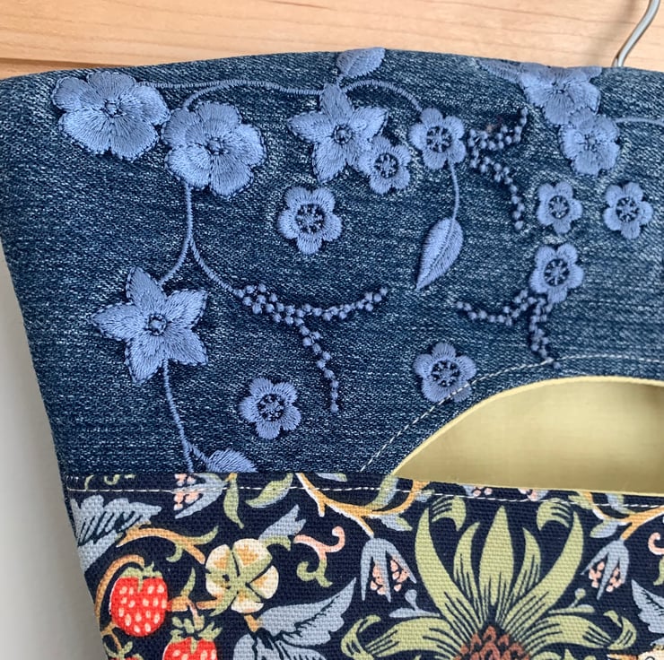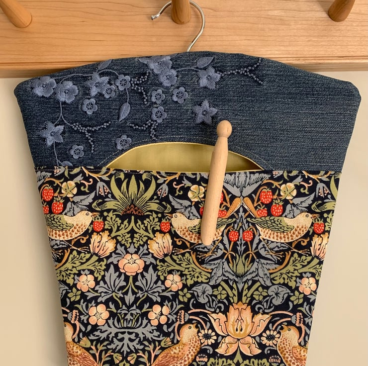 Peg bag made from a patchwork of reclaimed denim and Strawberry Thief cotton designed by William Morris. Some of the denim panels are embroidered with flowers. Fully lined with yellow cotton. It hangs from a strong wood and metal hanger.