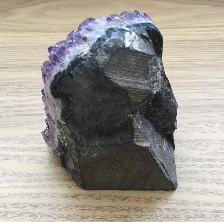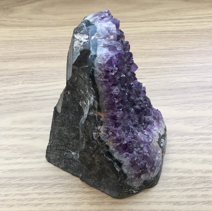 A love of pretty stones, whether they are officially gemstones or not, has led to a trial in shaping this amethyst geode into a standing display piece. The front displaying the geometric amethyst crystal projections, the base smoothed flat but left as natural stone. The sides offer a view of the differing layers of the stone of the geode. There are other cut and smoothed areas to try to reduce bulk and weight.