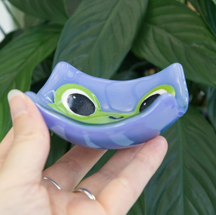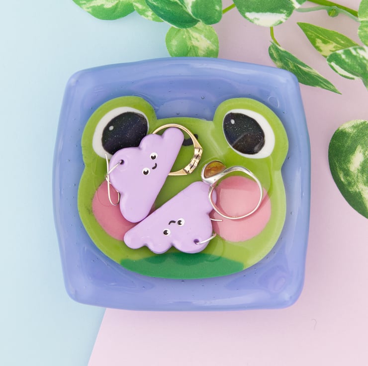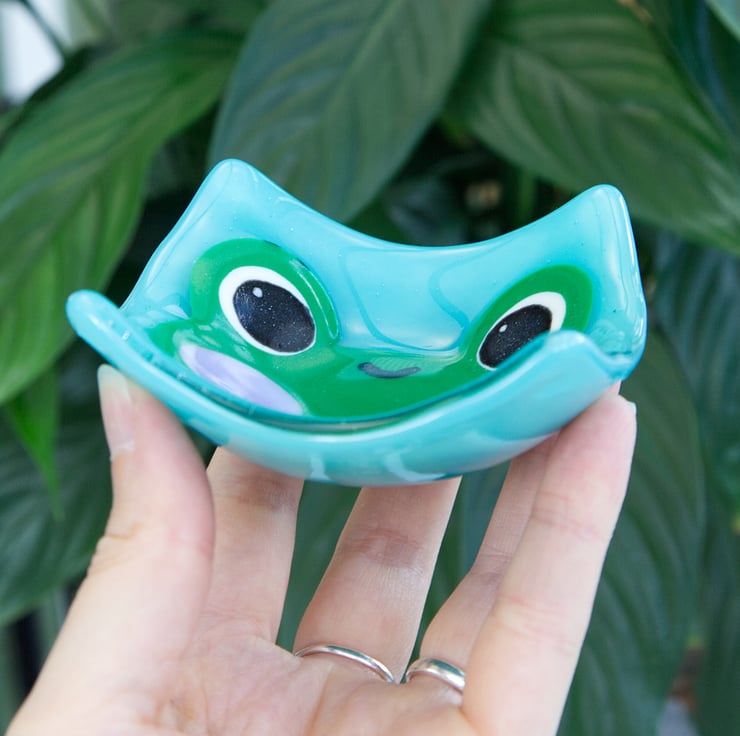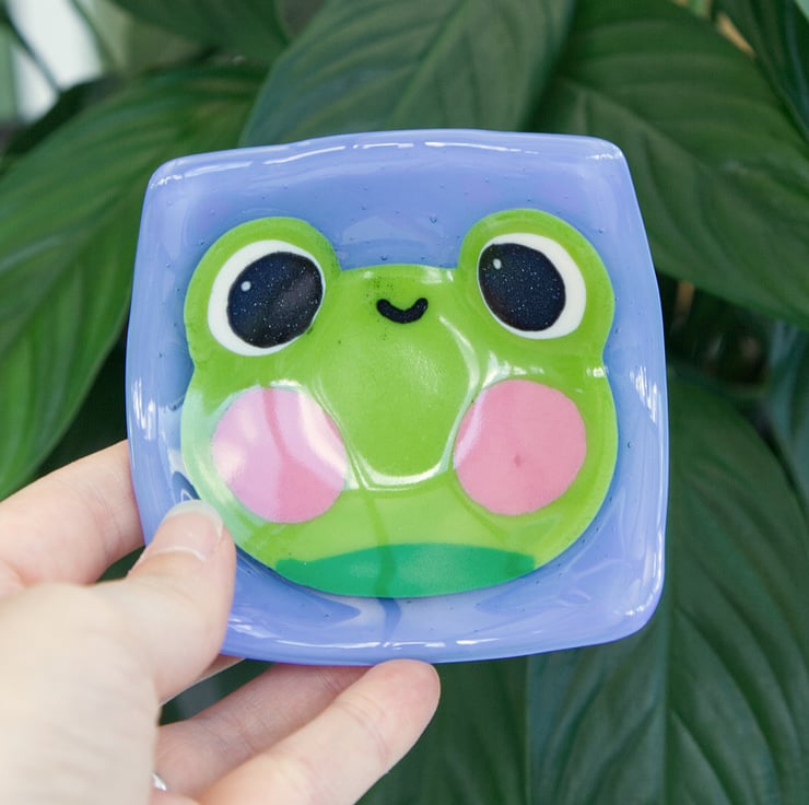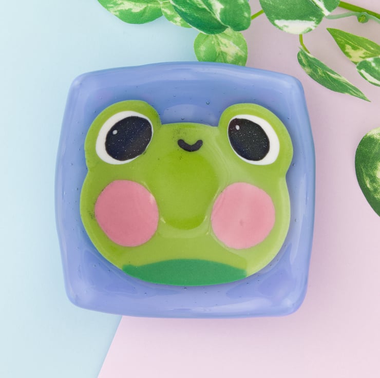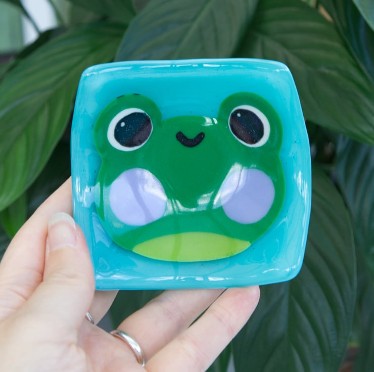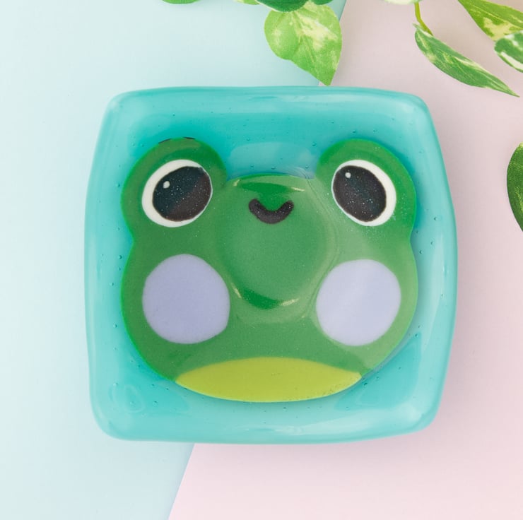 Two adorable little square trinket dishes with a cute froggy face in the middle of them. They make a perfect little happy gift for anyone in your life. Each dish has been handmade from 100% glass and fired three times in the kiln. They're perfect for storing rings, earrings, or even a tealight.