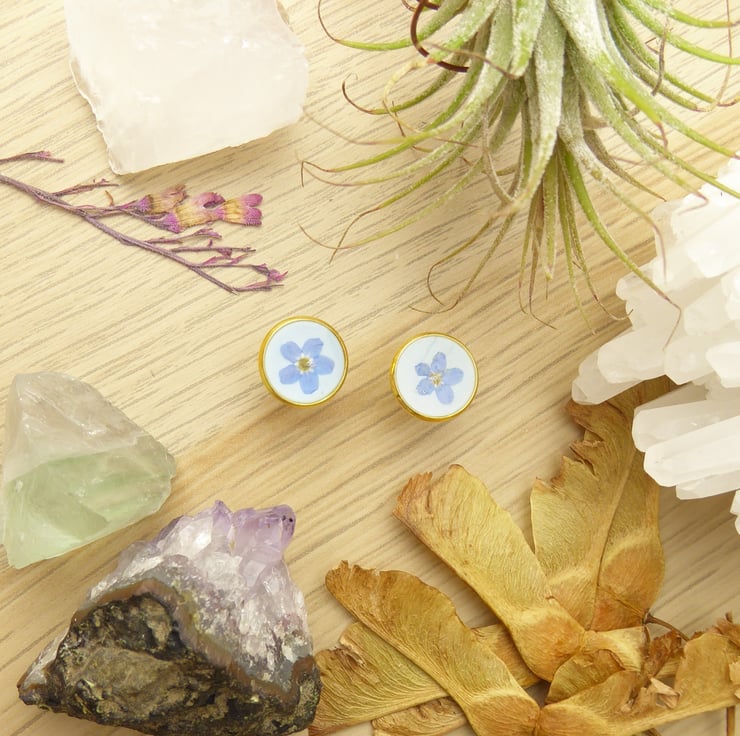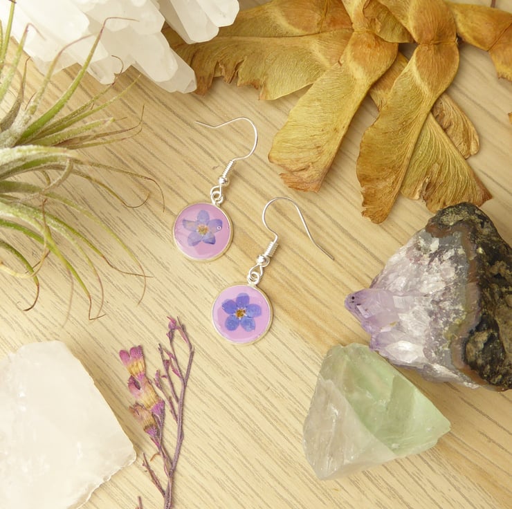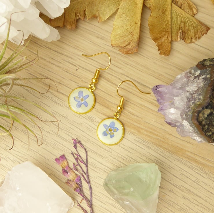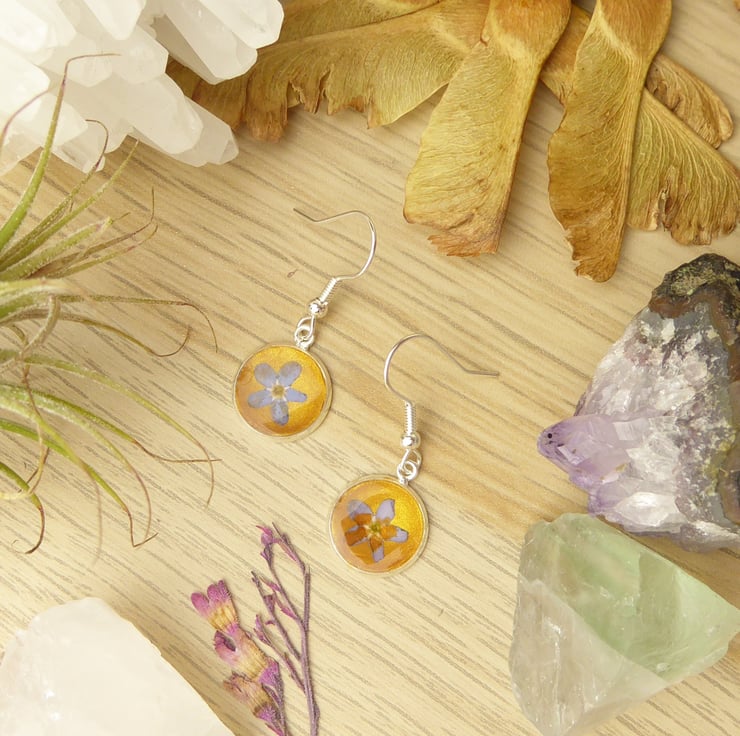 Delicate and pretty forget me not flowers have been pressed and used to create this collection of earrings.