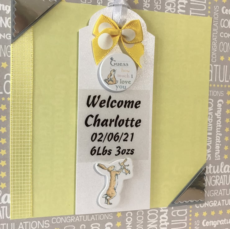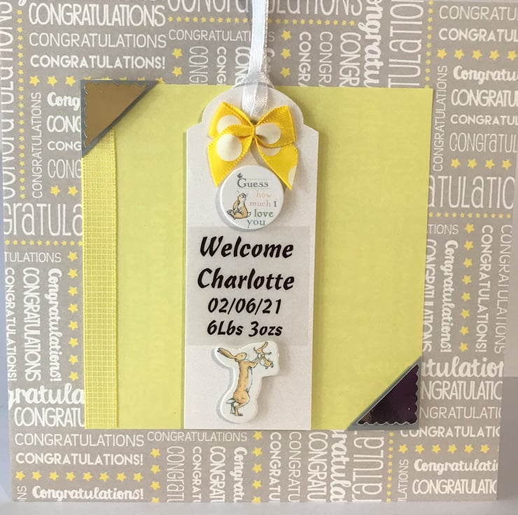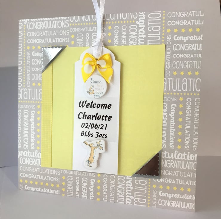 Personalised Cute little baby girl or boy handmade card. Yellow, grey and white Congratulations background paper with yellow and white centre piece with 'Welcome Charlotte 02/06/21 6lbs 3 ozs' with cute little rabbit with flower embellishments and cute yellow and white bow.
