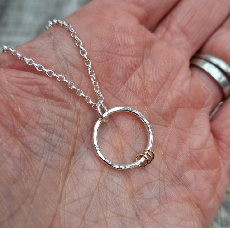 This elegant necklace features a sterling silver hammered circle adorned with three delicate gold rings, creating a beautiful contrast of metals. Handmade in Bristol, UK, from recycled silver and gold, this piece embodies both style and sustainability. The simple yet sophisticated design makes it a versatile accessory, perfect for layering or wearing on its own. A thoughtful gift for someone special or a meaningful addition to your own jewellery collection.