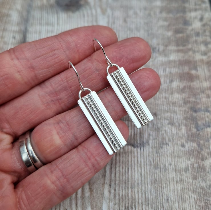 These elegant rectangle ribbon earrings are crafted from recycled sterling silver, featuring a striking design that combines polished and textured elements. The delicate silver beads running down the center add a unique touch, creating a beautiful contrast against the sleek surfaces of the earrings.