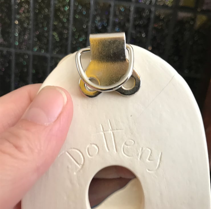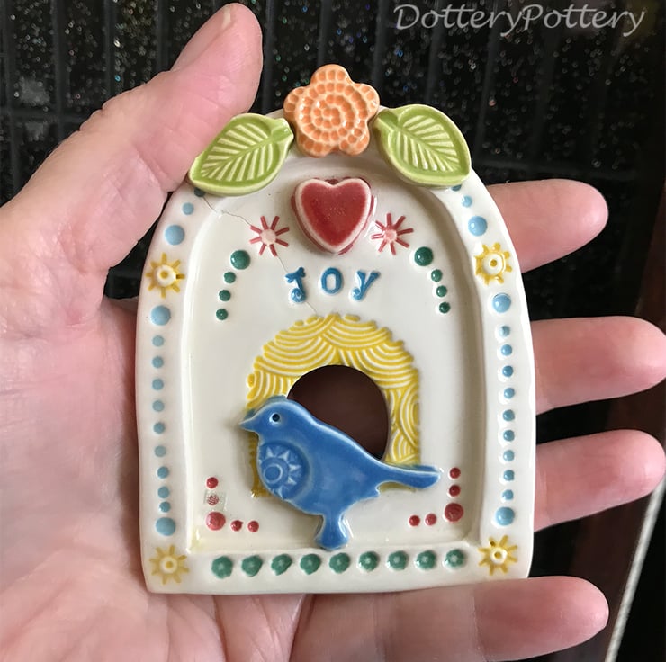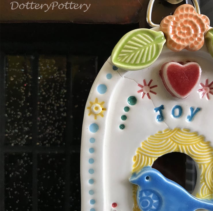 This pottery decoration is made from white earthenware clay and decorated with pattern, raised detailing and a little blue bird. It has been fired twice and finished with a shiny clear glaze. It measures 10cm x 7cm and hangs from a D ring. This one has a hairline crack to the left hand side as shown in photos. It is still strong as I have glazed over the crack but I wouldn't recommend hanging it outside. Reduced price.