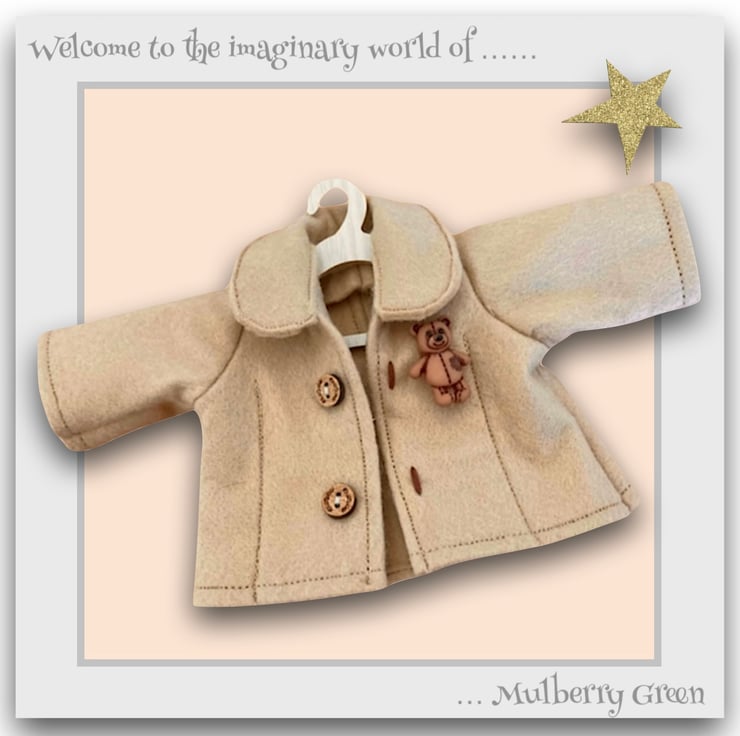 A beautiful tailored jacket to fit the Mulberry Green dolls. The jacket is in camel and is decorated with a little teddy bear. It is finished two little wooden buttons.