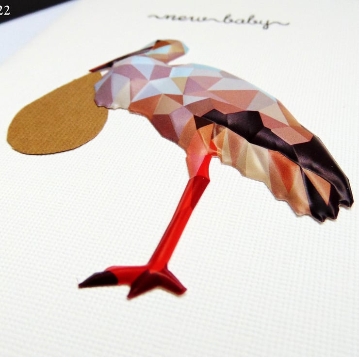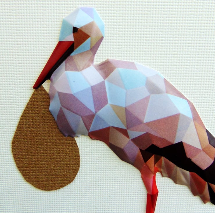 The plastic stork embellishment has been affixed to the card alongside the hand-cut textured paper bag.