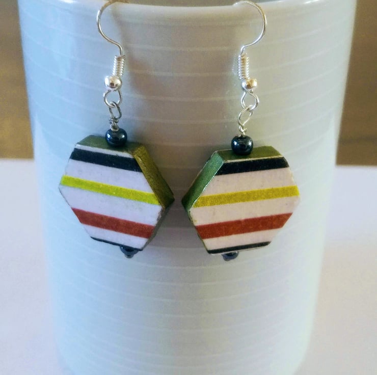 Contemporary geometric wood earrings. Decoupaged and hand painted with a cheerful bright stripe design. Very light weight on silver plated ear wires. All ear wires are alloy and nickel free. Part of the art Jewelery range.