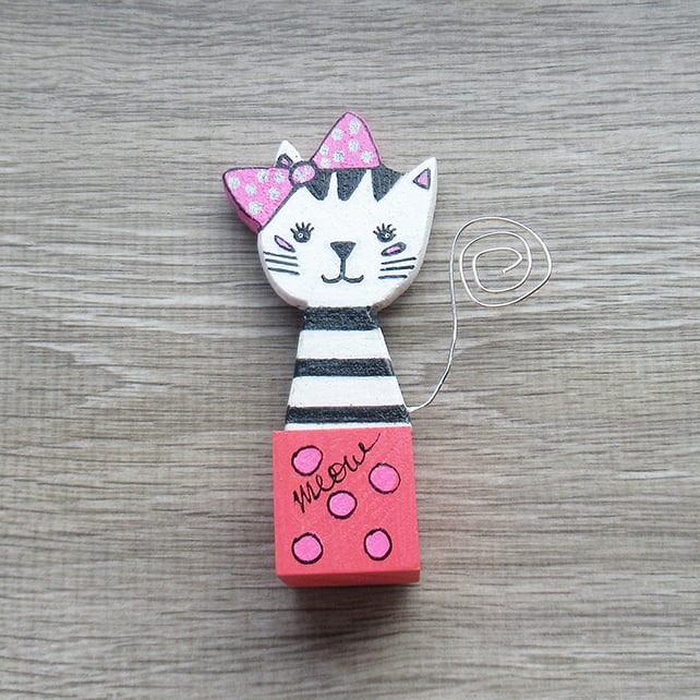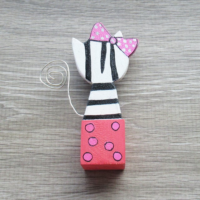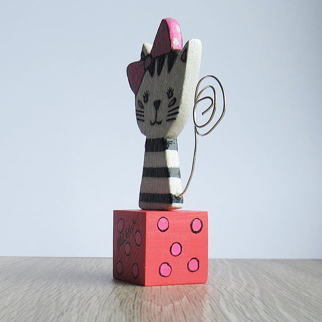 Hand painted and hand-carved fun cat ornament. This fun little black and white striped cat, stands proudly on a wooden cube stand, which has been painted using acrylic paints in a peachy pink colour with pink polka dots. A cute pink bow with silver polka dots adorns it’s head.