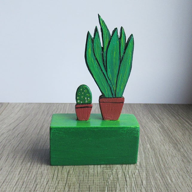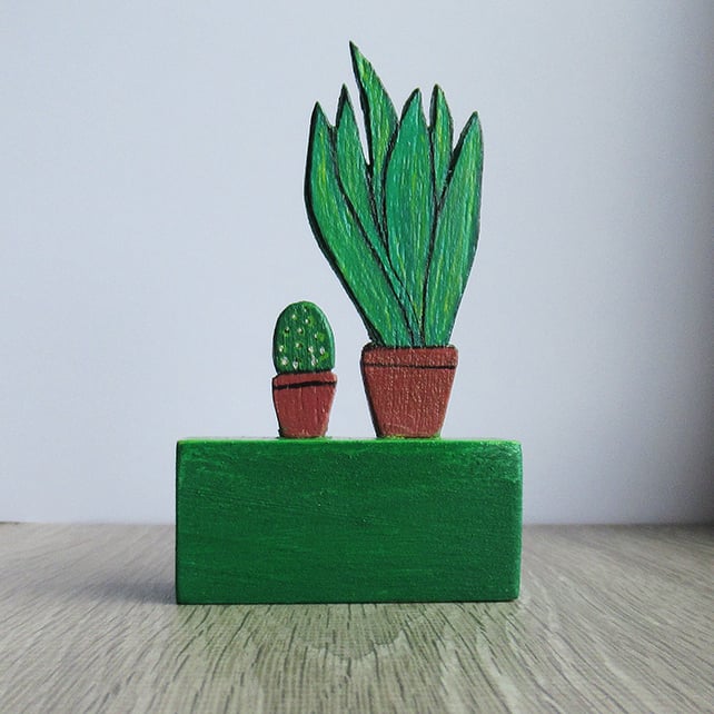 Fun aloe plant and cactus ornament comprised of a hand carved and hand acrylic painted wooden aloe plant and a little cacti.